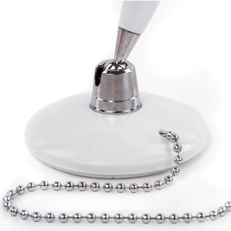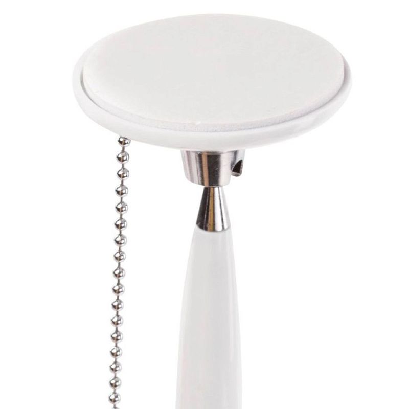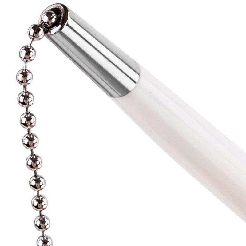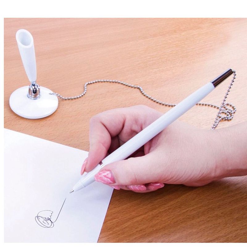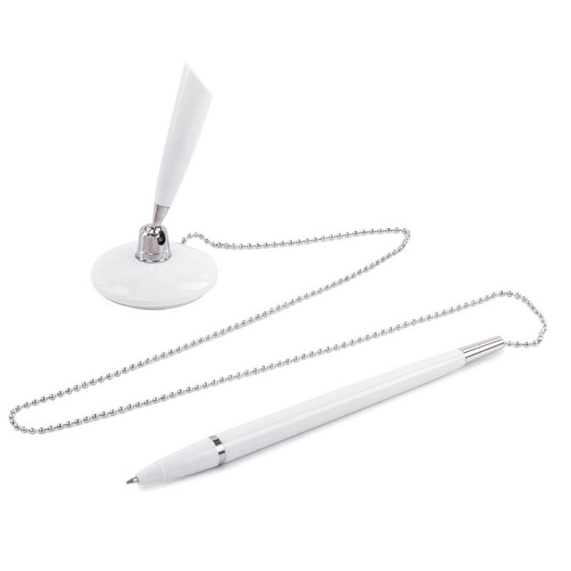 Корпус ручки и подставки выполнен из пластика белого цвета с хромированными деталями. Ручка крепится к подставке с помощью крепкой цепочки и фиксируется на любой ровной поверхности с помощью клейкого основания. Длина стержня составляет 130 мм. Диаметр основания - 5 см. Создает линию письма толщиной 0,5 мм. Цвет чернил - синий.