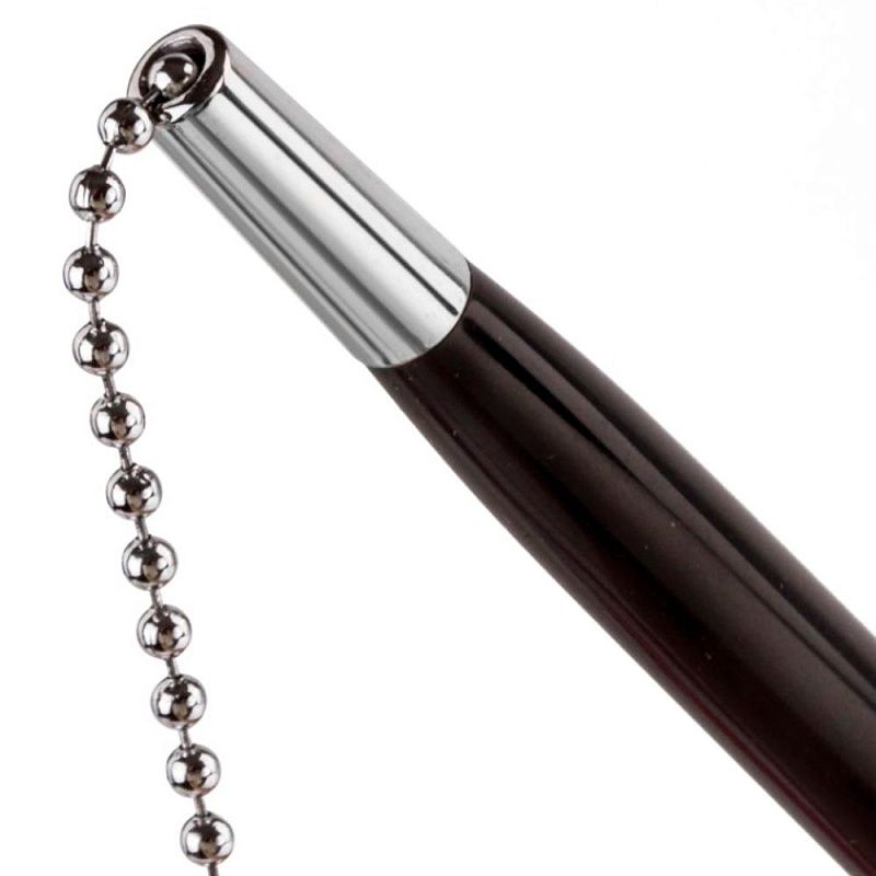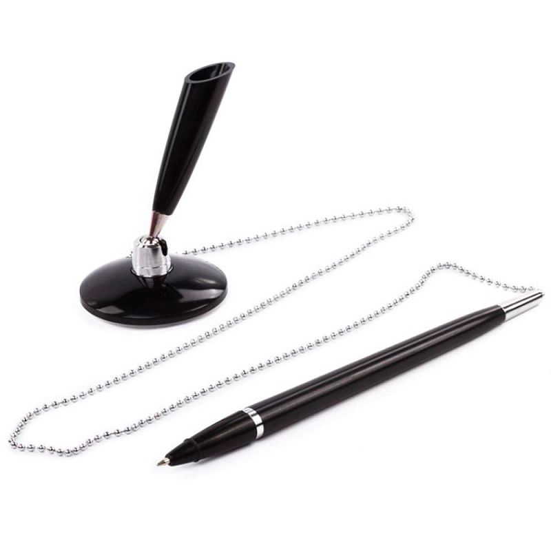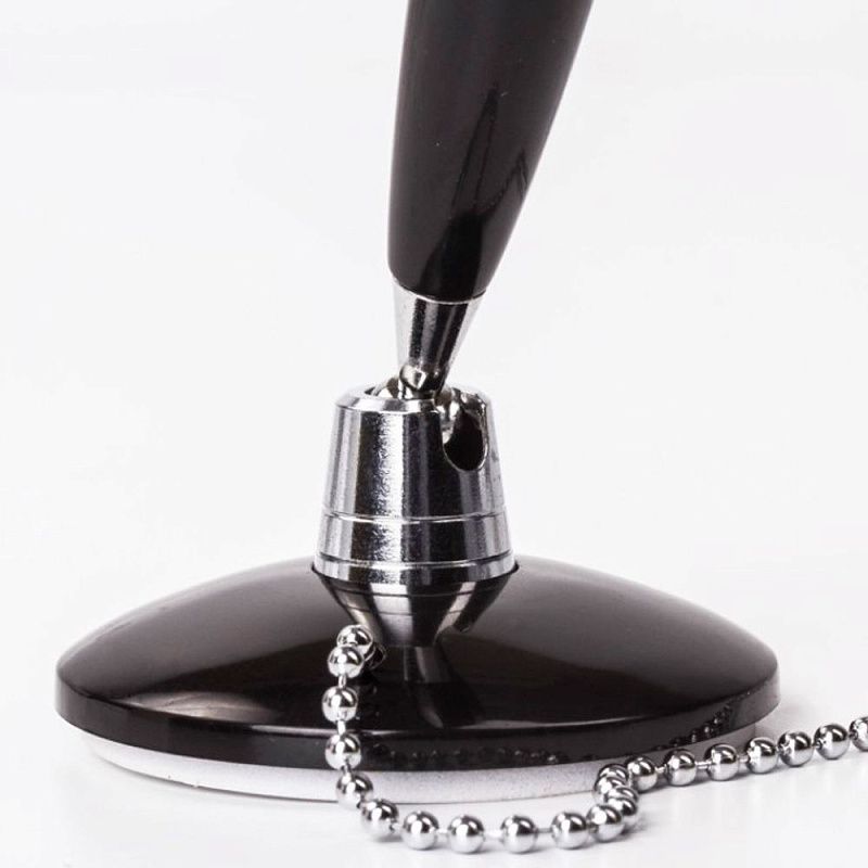 Корпус ручки и подставки выполнен из пластика белого цвета с хромированными деталями. Ручка крепится к подставке с помощью крепкой цепочки и фиксируется на любой ровной поверхности с помощью клейкого основания. Длина стержня составляет 130 мм. Диаметр основания - 5 см. Создает линию письма толщиной 0,5 мм. Цвет чернил - синий.