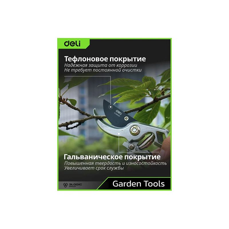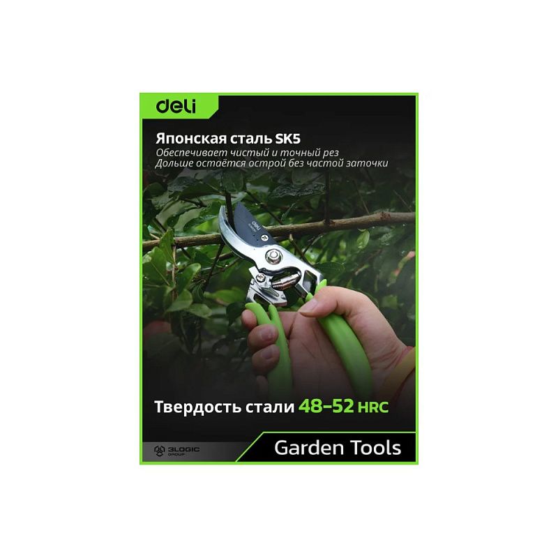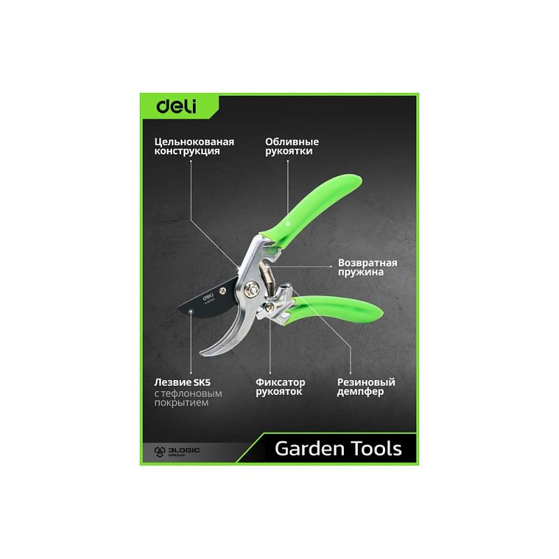 Секатор садовый цельнокованный Deli GS EDL580207, пружина, тефлон, 215 мм., черный, зеленый