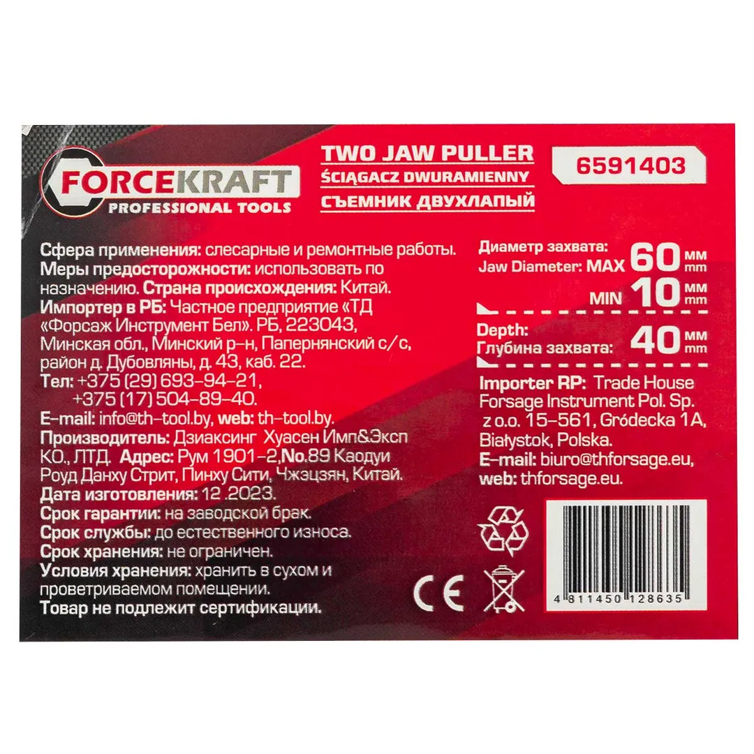 Съемник двухлапый Ø захвата- 60 мм, глубина захвата - 40 мм ForceKraft FK-6591403, описание и характеристики: