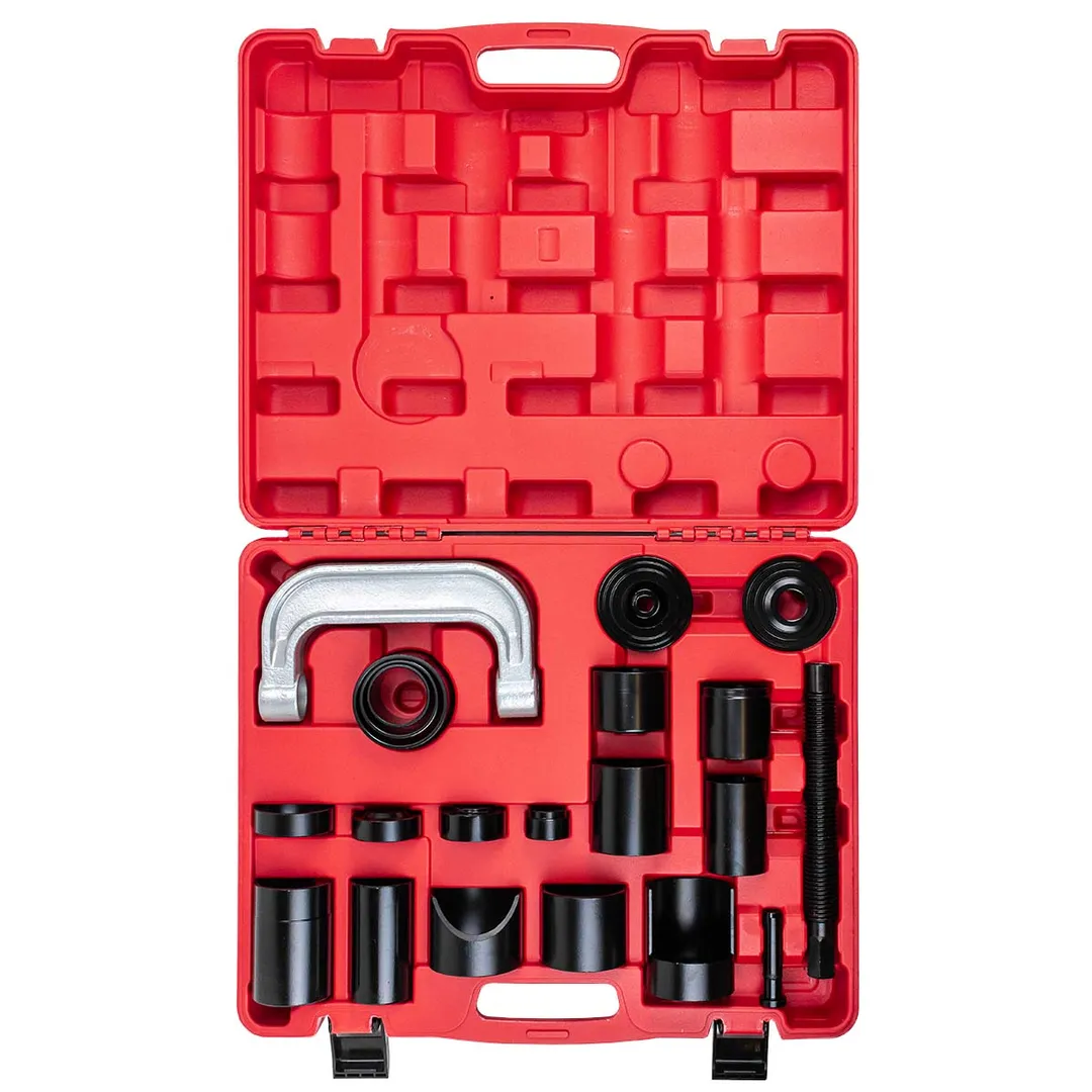 Съемник сайлентблоков и подшипников с набором оправок. Съемник для выдавливания штифтов и втулок подвески без необходимости демонтажа подузла. Устраняет необходимость снимать заднюю или переднюю поперечную балку. В наборе 21 предмет. Для удобного хранения и транспортировки поставляется в прочном пластиковом кейсе ехнические данные: 1 х Винтовой пресс - диаметр винта 28 мм для ключа 22 длина 255 мм; диск для втачивания гильз : 77мм на 25мм; диск для втачивания гильз :78мм на 12,5 мм; Оправки с размерами: Внутренний диаметр 23,0 мм / внешний диаметр 37,0 мм / высота 23,0 мм; Внутренний диаметр 45,0 мм / внешний диаметр 51,0 мм / высота 45,0 мм; Внутренний диаметр 45,0 мм / внешний диаметр 51 мм / высота 94 мм; Внутренний диаметр 46,0 мм / внешний диаметр 50 мм / высота 73,5 мм; Внутренний диаметр 46,0 мм / внешний диаметр 54,0 мм / высота 25,5 мм; Внутренний диаметр 48,5 мм / внешний диаметр 56,5 мм / высота 21,0 мм; Внутренний диаметр 51,0 мм / внешний диаметр 57,0 мм / высота 62 мм; Внутренний диаметр 55,0 мПреимущества работы с нами