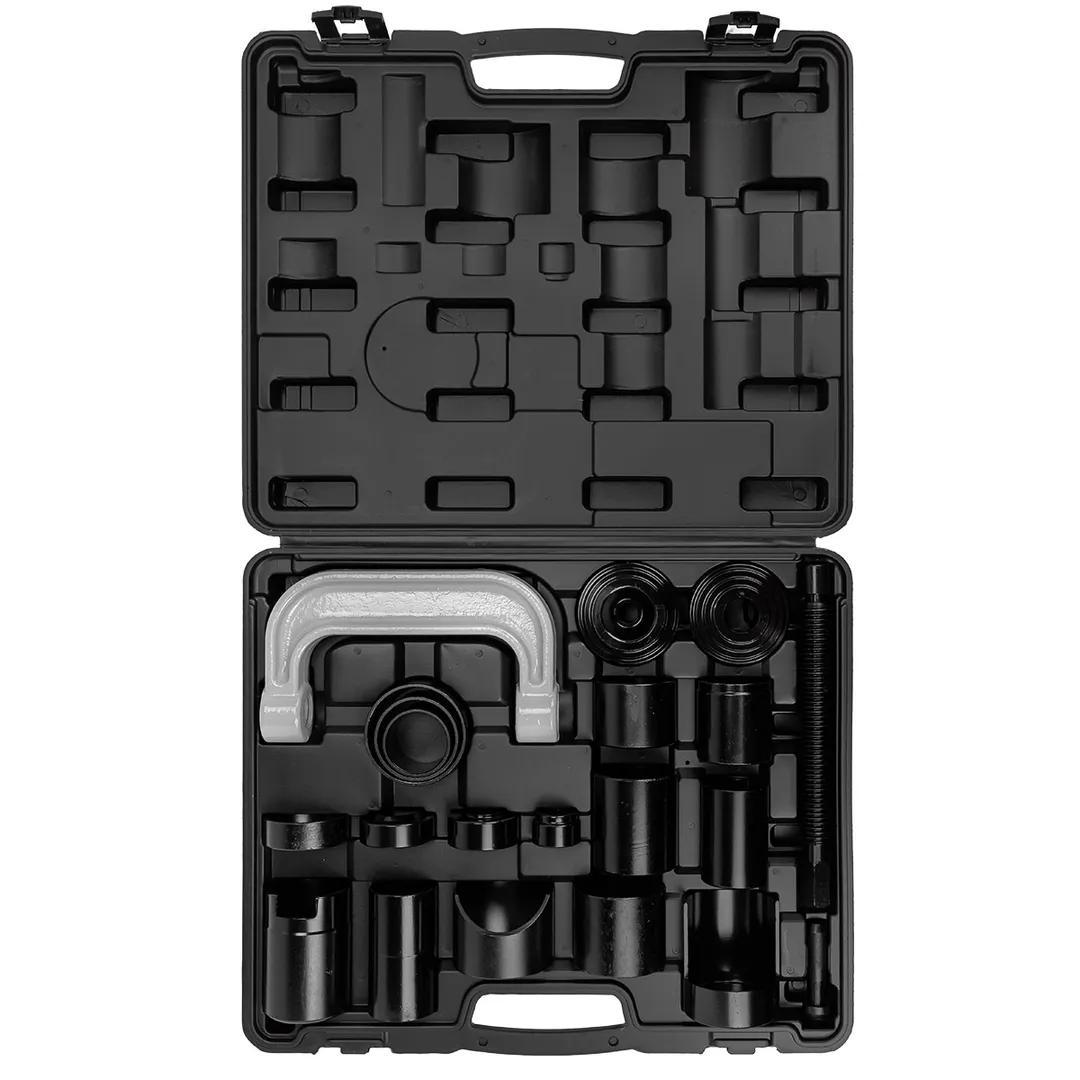 Съемник сайлентблоков и подшипников с набором оправок. Съемник для выдавливания штифтов и втулок подвески без необходимости демонтажа подузла. Устраняет необходимость снимать заднюю или переднюю поперечную балку. В наборе 21 предмет. Для удобного хранения и транспортировки поставляется в прочном пластиковом кейсе ехнические данные: 1 х Винтовой пресс - диаметр винта 28 мм для ключа 22 длина 255 мм; диск для втачивания гильз : 77мм на 25мм; диск для втачивания гильз :78мм на 12,5 мм; Оправки с размерами: Внутренний диаметр 23,0 мм / внешний диаметр 37,0 мм / высота 23,0 мм; Внутренний диаметр 45,0 мм / внешний диаметр 51,0 мм / высота 45,0 мм; Внутренний диаметр 45,0 мм / внешний диаметр 51 мм / высота 94 мм; Внутренний диаметр 46,0 мм / внешний диаметр 50 мм / высота 73,5 мм; Внутренний диаметр 46,0 мм / внешний диаметр 54,0 мм / высота 25,5 мм; Внутренний диаметр 48,5 мм / внешний диаметр 56,5 мм / высота 21,0 мм; Внутренний диаметр 51,0 мм / внешний диаметр 57,0 мм / высота 62 мм; Внутренний диаметр 55,0 мм / внешний диаметр 62,5 мм / высота 91 мм - с вырезом 75,0 мм; Внутренний диаметр 56,5 мм / внешний диаметр 64,5 мм / высота 70 мм; Внутренний диаметр 57,0 мм / внешний диаметр 63,0 мм / высота 20,0 мм; Внутренний диаметр 57,0 мм / внешний диаметр 63,0 мм / высота 45,0 мм; Внутренний диаметр 57,0 мм / внешний диаметр 63,0 мм / высота 60,5 мм; Внутренний диаметр 62,0 мм / внешний диаметр 70,0 мм / высота 58,0 мм; Внутренний диаметр 67,0 мм / внешний диаметр 72,0 мм - высота выточки 30,0 мм / общая высота 85,5 мм; Внутренний диаметр 69,0 мм / внешний диаметр 76,0 мм - высота выточки 31,0 мм / общая высота 58,0 мм; Внутренний диаметр 69,0 мм / внешний диаметр 76,0 мм / высота 55,0 мм; Штифт диаметром 16мм и длиной 75 мм.Преимущества работы с нами