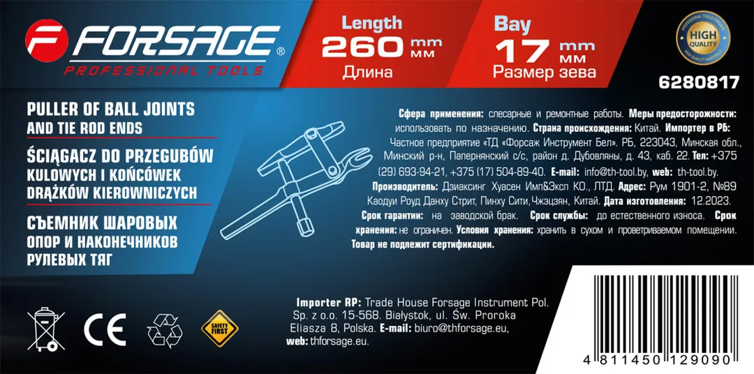 Съемник шаровых опор и наконечников рулевых тяг удлиненный, L260 мм, размер зева 17 мм Forsage F-6280817