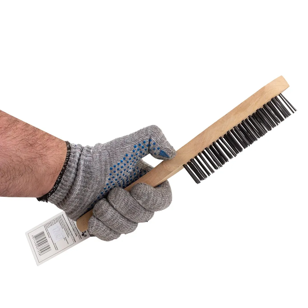 Щетка по металлу ручная (корщетка) в деревянном корпусе поможет зачистить поверхность от ржавчины, старой краски и прочих загрязнений. Шлифует и полирует швы и налет после сварки, устраняет заусеницы и другие дефекты на заготовках. Материал проволоки - высокоуглеродистая сталь, 5x15 рядов. Щетку по металлу используют при ремонте, сварочных работах, изготовлении изделий из стальных профилей или труб. Щетка оснащена удобной деревянной ручкой изогнутой конструкцией, благодаря которой удобно держать в руке. На рукоятке имеется отверстие для подвешивания.Преимущества работы с нами