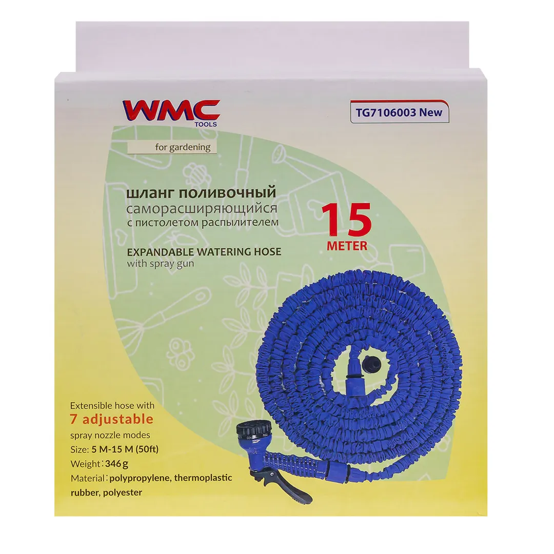 Шланг поливочный расширяющийсяв комплекте с распылителем 15 м, 7 режимов полива WMC TOOLS WMC-TG7106003 New