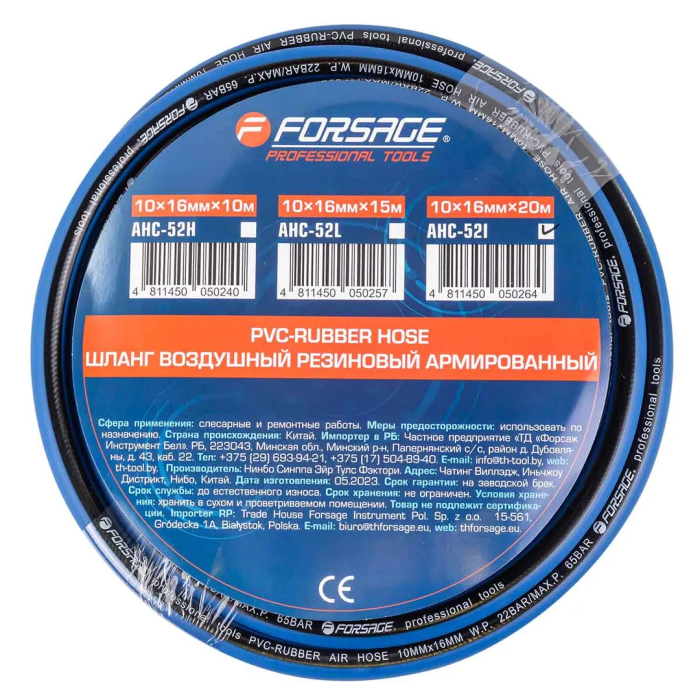 Пневмошланг воздушный резиновый армированный 10х16 мм, 20 м Forsage F-AHC-52I