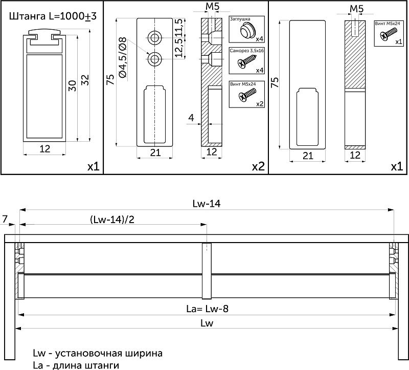 Наличие демпфера предотвращает шумное движение вешалок-плечиков и защищает штангу от царапин, толщина стенки 0,9 мм. Штанга выполнена из алюминия, цвет: графит браш. В комплекте: труба гардеробная прямоуг. L-1000 с демпфером - 1 шт. ; держатель концевой - 2 шт. ; держатель проходной - 1 шт. ; пластиковая заглушка - 4 шт, PH саморез с потайной головкой d3*16 - 4 шт. ;PH винт с потайной головкой M5*24 - 3 шт.Технические характеристики: