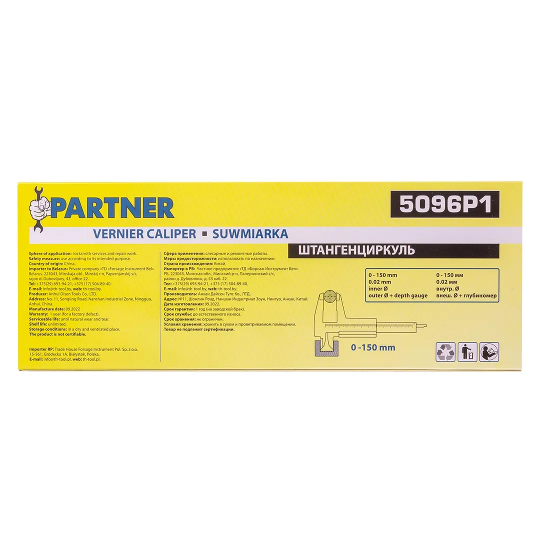 Штангенциркуль, 0-150 мм, 0.02 мм; внутр. Ø, наруж. Ø + глубиномер Partner PA-5096P1, описание и характеристики: