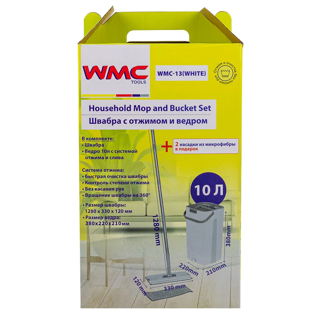 Швабра малая c телескопической ручкой в комплекте с ведром для отжима, цвет белый WMC TOOLS WMC-13(white)