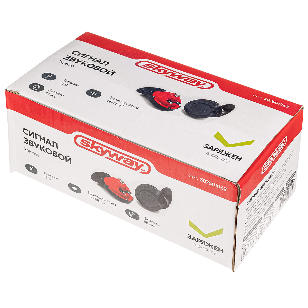 Сигнал звуковой УЛИТКА SKYWAY d=3D88мм 12В 115дБ сталь/пластик 2 шт/комп - звуковой сигнал в форме улитки для легковых автомобилей. Обеспечивает безопасность во время движения или на парковке. Громкий звук оповещает окружающих о приближении автомобиля. Корпус выполнен из прочных материалов для надежного крепления и эксплуатации.