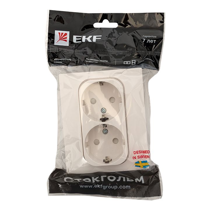 Стокгольм Розетка 2-местная с/з 16А автоматические клеммы белая с защ, штор, EKF PROxima EXR16-128-10