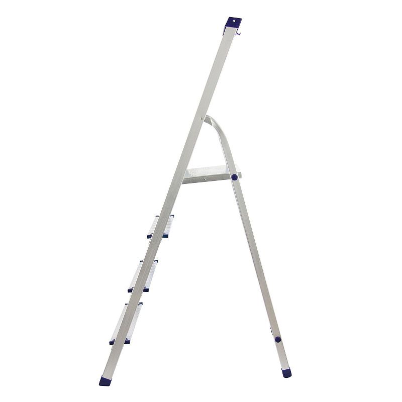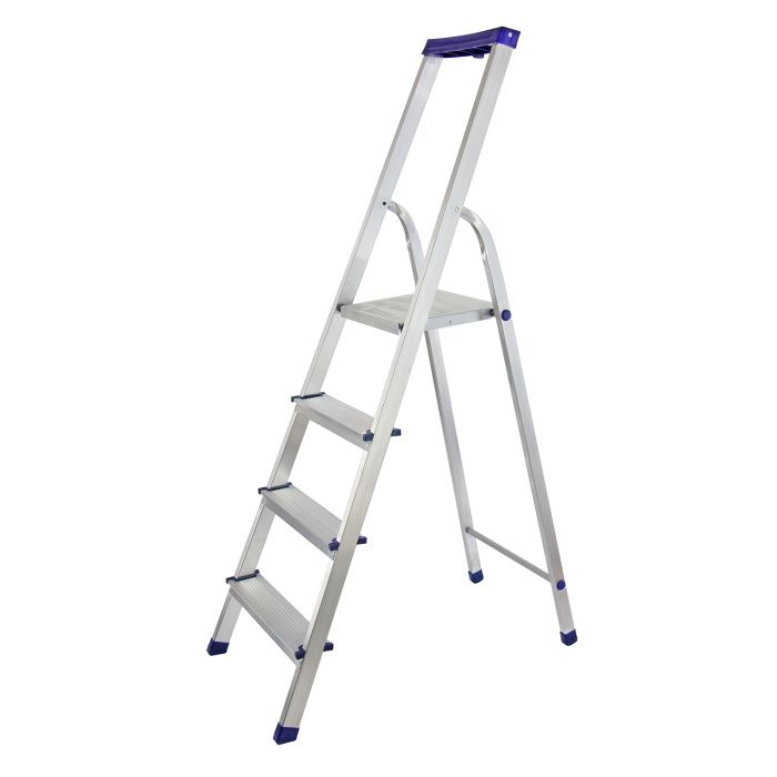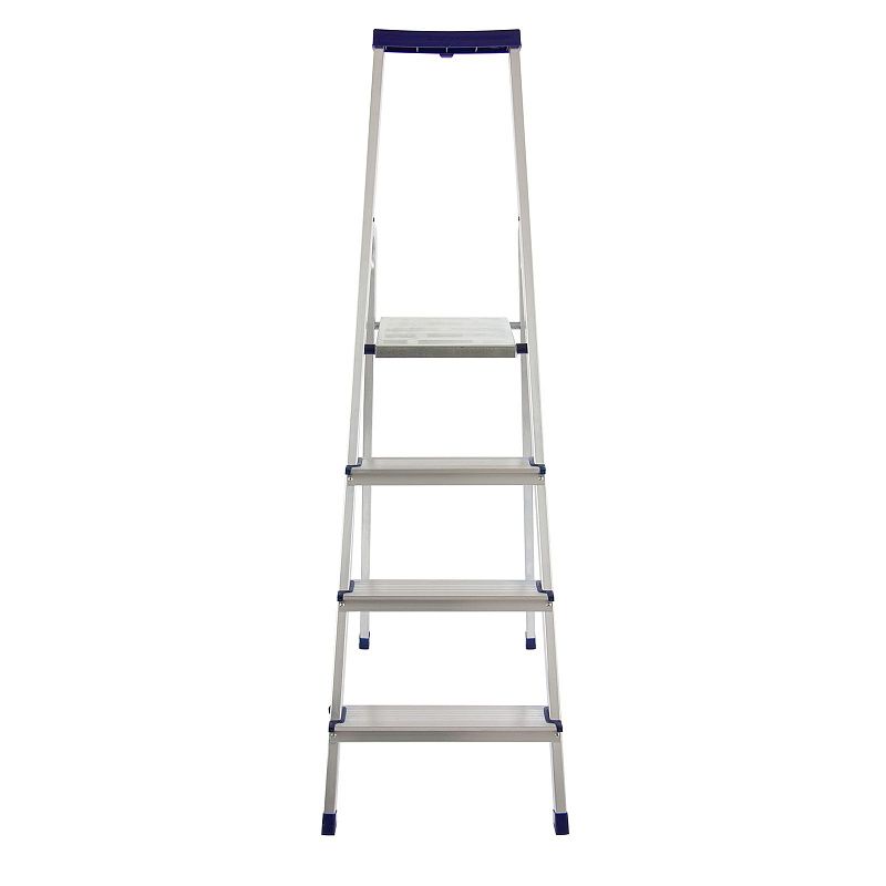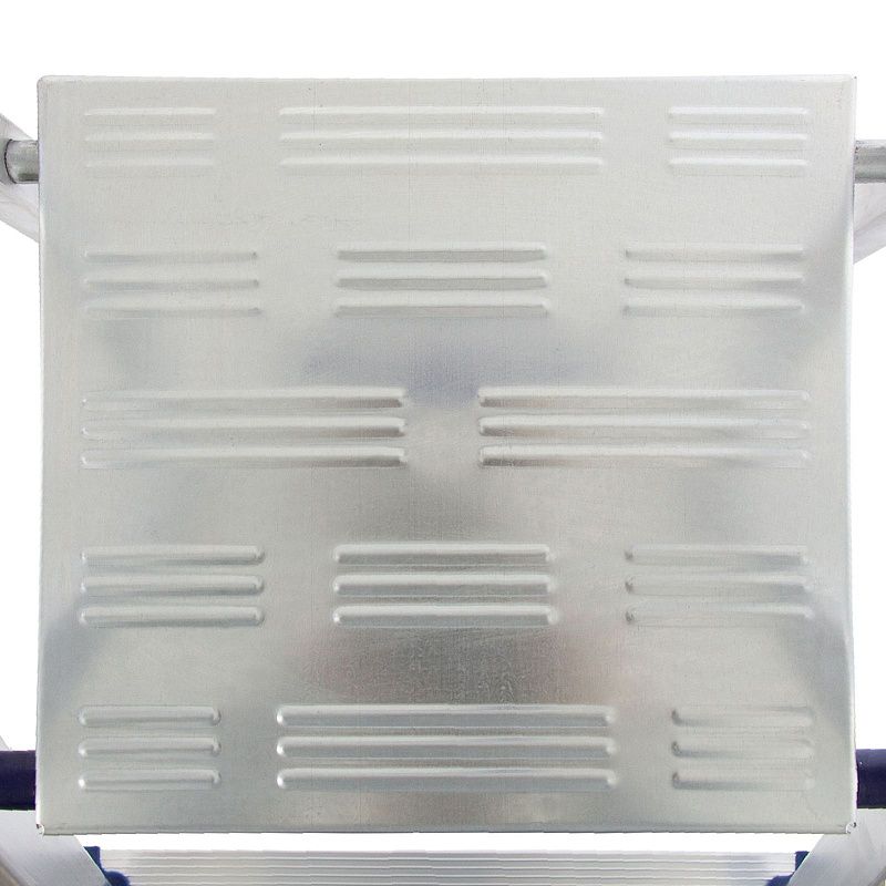Стремянка алюминиевая Сибртех «Универсал» 97894 с 4 ступенями — складная лестница для отделочных и монтажных работ на высоте, превышающей человеческий рост. Площадка находится на высоте 81,5 см от опорной поверхности, рабочая высота стремянки составляет 281,5 см (при среднем росте пользователя 170 см). Высокая дуга обеспечивает безопасность пользователя. Стремянка удобна для длительной работы, используется во время строительства и ремонта, а также в быту.