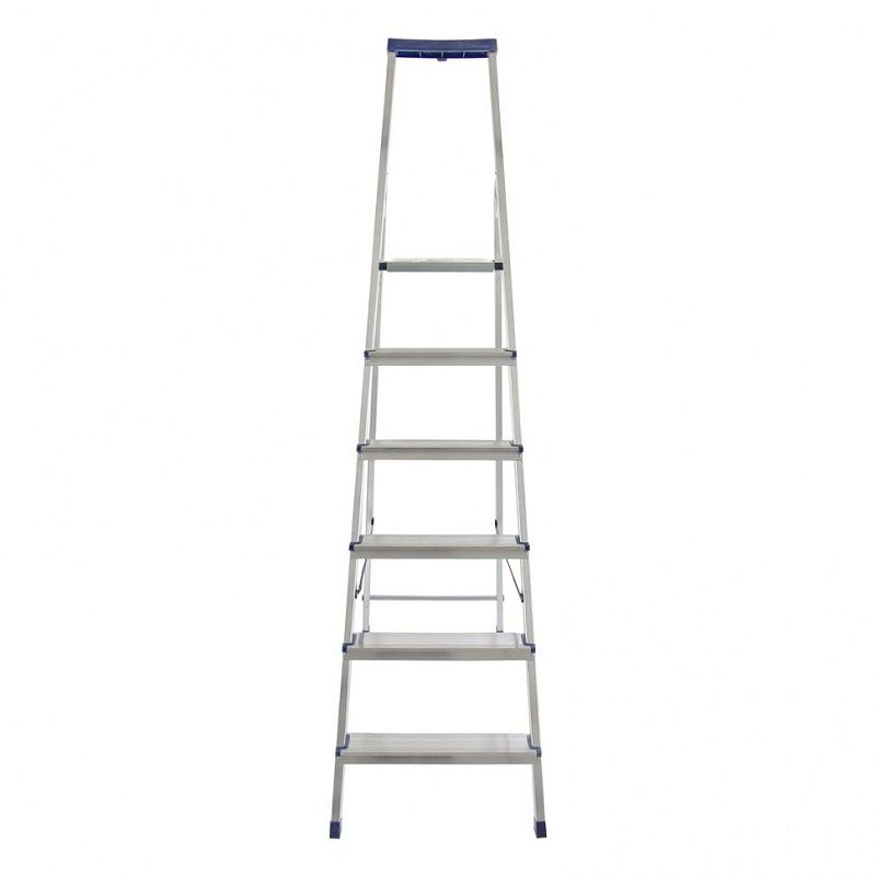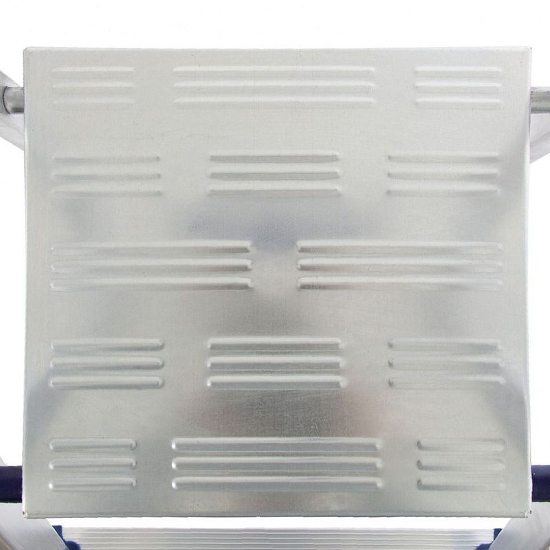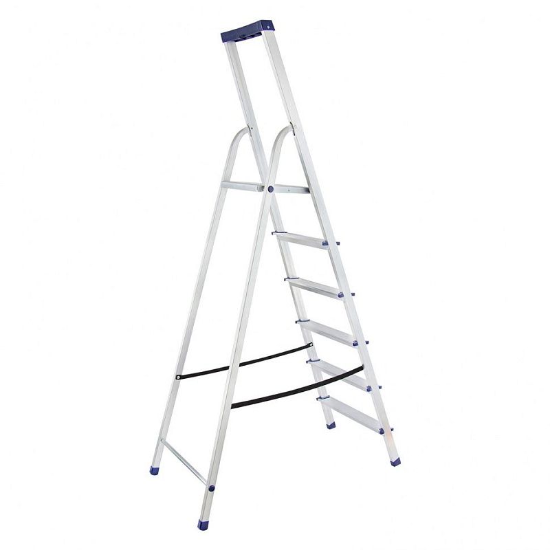 Стремянка алюминиевая Сибртех «Универсал» 97896 с 6 ступенями — складная лестница для отделочных и монтажных работ на высоте, превышающей человеческий рост. Площадка находится на высоте 124,5 см от опорной поверхности, рабочая высота стремянки составляет 324,5 см (при среднем росте пользователя 170 см). Высокая дуга обеспечивает безопасность пользователя. Стремянка удобна для длительной работы, используется во время строительства и ремонта, а также в быту.
