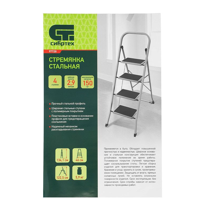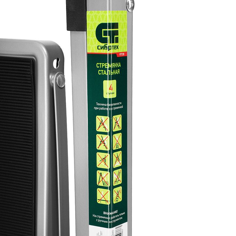 Стальная стремянка Сибртех 97728 с 4 широкими ступенями размером 20 x 30 см, с полимерным покрытием, позволяет выполнять различные работы на высоте, превышающей человеческий рост. С ее помощью можно достать нужный предмет с полки, покрасить стену, поменять лампочку, вытереть пыль на шкафу и т.д. Верхняя ступень находится на высоте 88 см от опорной поверхности, рабочая высота составляет 288 см (при среднем росте пользователя 170 см). Дуга безопасности и широкие ступени с нескользящим покрытием обеспечивают устойчивое положение пользователя. Стремянку следует размещать на ровной поверхности и использовать для работы только с ручным инструментом.