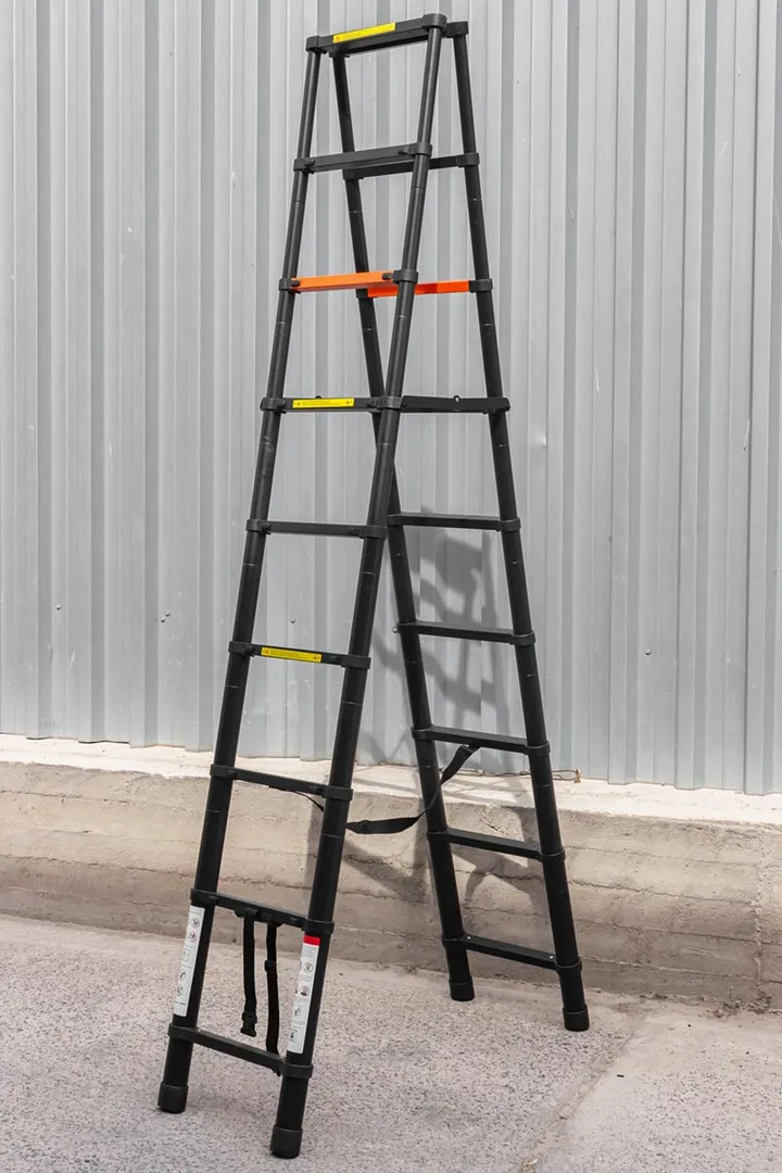 Лестница стремянка телескопическая алюминиевая, максимальная нагрузка: 150 кг. Состоит из двух секций: максимальная высота одной секции 2,6 м на 9 ступенек. Конструкция: лестница трансформер, складная, неразборная. Двухстороннее восхождение с возможностью регулировки высоты подъема. Противоскользящие накладки на ножках обеспечивают устойчивость и безопасность. Оборудована крепежным ремнем для фиксации ступенек. Оснащена фиксатором для защиты от складывания при работе. Изготовлена из алюминиевого сплава высокой прочности, обладающего коррозийной стойкостью. Применяется для проведения ремонтных, строительных и монтажных работ любой сложности. Компактные размеры в сложенном виде (для удобства хранения и транспортировки). Надежная конструкция в сочетании с высокопрочным металлом.Преимущества работы с нами
