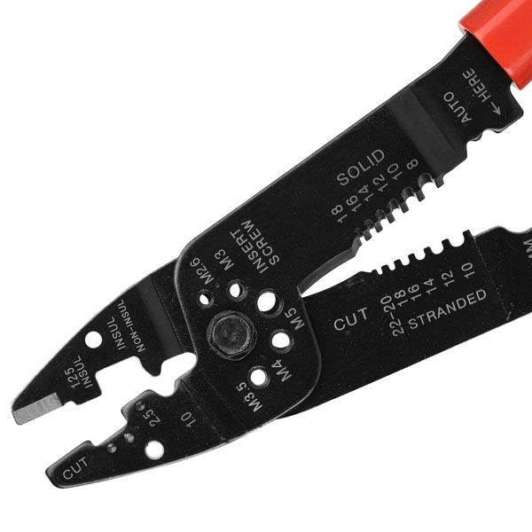 Острые режущие кромки позволяют легко снимать изоляцию с проводов или перекусывать их. Предусмотрена функция обжима наконечников - как изолированных, так и неизолированных. Специальные отверстия в корпусе инструмента для перекусывания болтов различного диаметра для их подгонки по длине при фиксации обжатых наконечников. Эргономичные рукоятки обеспечивают комфортное использование.