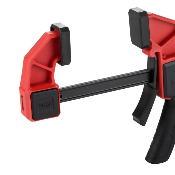 Быстрозажимная струбцина HCLQ01-0300 представляет собой удобное приспособление для фиксации заготовок. Опорная губка перемещается и фиксируется по всей длине направляющей при помощи рукоятки, а также может переставляться на другой конец направляющей, что позволяет использовать струбцину «на разжим».
