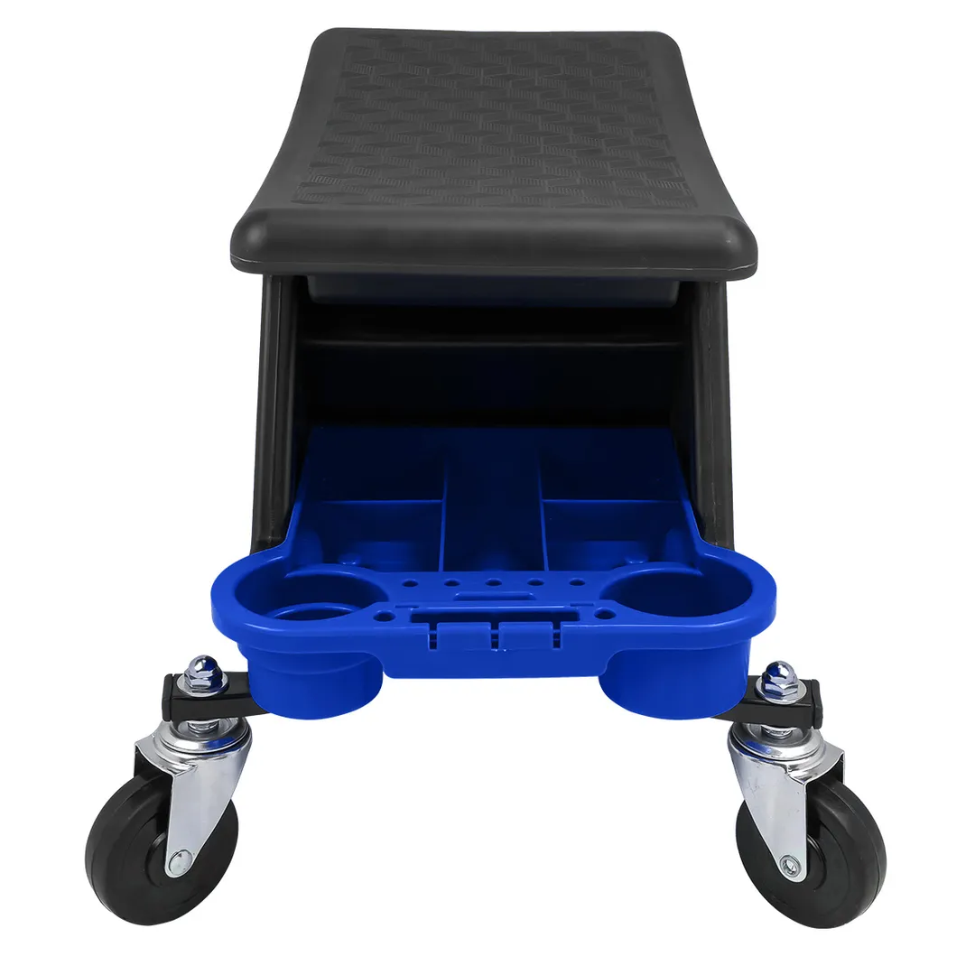 Стул пластиковый передвижной разработан для мастерских, автомастерских, СТО, гаражей, личного использования. Удобное сиденье изогнутой формы. Комфорт при выполнении долгих и сложных работ. Комплектуется ложементом и выдвижным ящиком для хранения инструментов и запчастей - все необходимое всегда под рукой. Качественное и комфортное место для выполнения работ в сидячем положении. Хорошая маневренность стула за счет поворотных колес на подшипниках. Фиксатор - тормоз на паре колес. Максимальная нагрузка до 130 кг. Высота стула 375мм Размеры сиденья 450х250мм Размеры ложемента 260х250х50мм Размеры выдвижного ящика 225х210х125 мм.Преимущества работы с нами