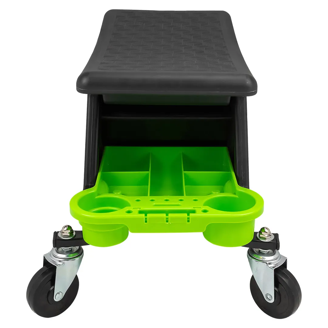 Стул пластиковый передвижной разработан для мастерских, автомастерских, СТО, гаражей, личного использования. Удобное сиденье изогнутой формы. Комфорт при выполнении долгих и сложных работ. Комплектуется ложементом и выдвижным ящиком для хранения инструментов и запчастей - все необходимое всегда под рукой. Качественное и комфортное место для выполнения работ в сидячем положении. Хорошая маневренность стула за счет поворотных колес на подшипниках. Фиксатор - тормоз на паре колес. Максимальная нагрузка до 130 кг. Высота стула 375мм Размеры сиденья 450х250мм Размеры ложемента 260х250х50мм Размеры выдвижного ящика 225х210х125 мм.Преимущества работы с нами