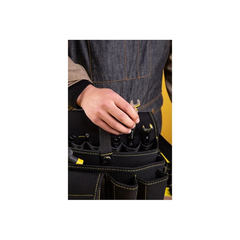 Невероятная вместимость при небольших размерах - всего 15 карманов под различный инструмент и оснастку - 2 основных объёмных отделения, карман на липучке, 6 сквозных петелек различных размеров и 6 небольших несквозных кармашков внутри основного отделения для отверток, гаечных ключей, свёрл/буров и пр.