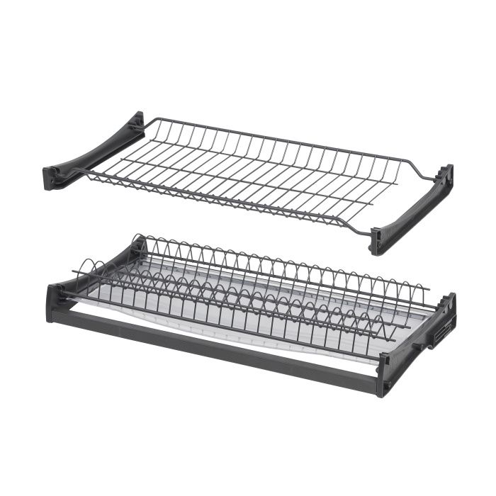 Сушка для посуды HUGOс профилем - базовая модель, которая отлично впишется в любой интерьер: - надежный и оптимальный прут: несущий - 5,3 мм, основной - 2,2 мм, - улучшенное устойчивое к коррозии коррозии порошковое покрытие (графит), - жесткий прозрачный поддон толщиной 2,5мм в комплекте (возможность приобрести второй поддон дополнительно), - регулируемый нижний держатель и слот под ДВП для установки в ящик без дна, - подходит для установки в ящик как с ДСП 18 мм, так и с ДСП 16 мм. Количество мест для тарелок: 500 - 18 мест, 600 - 23 мест, 700 - 28 мест, 800 - 32 мест, 900 - 37 мест. В комплекте: - стальная сушка для чашек (графит) - 1 шт, - стальная сушка для тарелок (графит) - 1 шт, - пластиковый поддон (прозрачный) - 1 шт, - пластиковый держатель (графит) - 4 шт, - алюминиевый профиль (графит) - 2 шт. , - пластиковая вставка (графит) - 4 шт, - комплект крепежей, - брендированная инструкция AKS - 1шт.Технические характеристики: