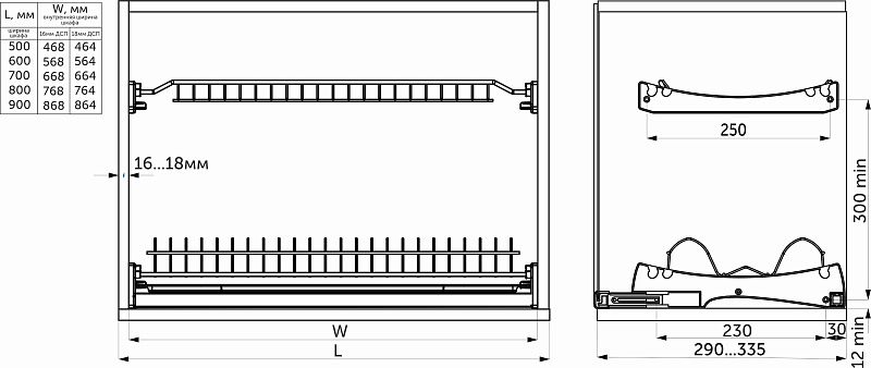 Сушка для посуды HUGOс профилем - базовая модель, которая отлично впишется в любой интерьер: -надежный и оптимальный прут: несущий - 5,3 мм, основной - 2,2 мм, -нержавеющая сталь, улучшенное устойчивое к коррозии гальваническое покрытие (хром), -жесткий прозрачный поддон толщиной 2,5мм в комплекте (возможность приобрести второй поддон дополнительно), -регулируемый нижний держатель и слот под ДВП для установки в ящик без дна, -подходит для установки в ящик как с ДСП 18 мм, так и с ДСП 16 мм. Количество мест для тарелок: 500 - 18 мест, 600 - 23 мест, 700 - 28 мест, 800 - 32 мест, 900 - 37 мест. В комплекте: -стальная сушка для чашек (хром) - 1 шт, -стальная сушка для тарелок (хром) - 1 шт, -пластиковый поддон (прозрачный) - 1 шт, -пластиковый держатель (серый) - 4 шт, -алюминиевый профиль (серый) - 2 шт. , -пластиковая вставка (серый) - 4 шт, -комплект крепежей, -брендированная инструкция AKS - 1шт.Технические характеристики: