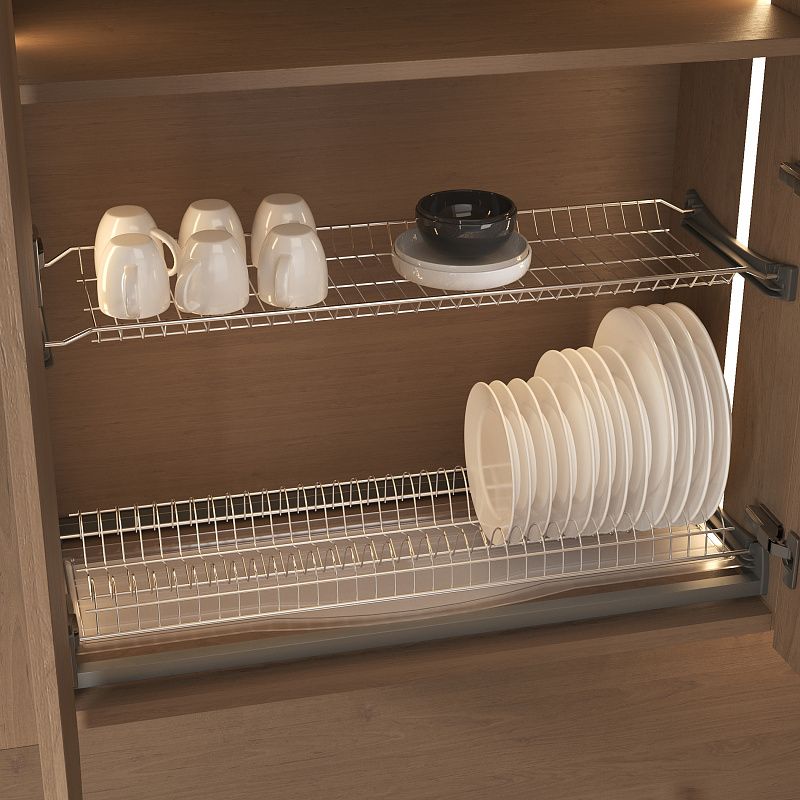 Сушка для посуды HUGOс профилем - базовая модель, которая отлично впишется в любой интерьер: -надежный и оптимальный прут: несущий - 5,3 мм, основной - 2,2 мм, -нержавеющая сталь, улучшенное устойчивое к коррозии гальваническое покрытие (хром), -жесткий прозрачный поддон толщиной 2,5мм в комплекте (возможность приобрести второй поддон дополнительно), -регулируемый нижний держатель и слот под ДВП для установки в ящик без дна, -подходит для установки в ящик как с ДСП 18 мм, так и с ДСП 16 мм. Количество мест для тарелок: 500 - 18 мест, 600 - 23 мест, 700 - 28 мест, 800 - 32 мест, 900 - 37 мест. В комплекте: -стальная сушка для чашек (хром) - 1 шт, -стальная сушка для тарелок (хром) - 1 шт, -пластиковый поддон (прозрачный) - 1 шт, -пластиковый держатель (серый) - 4 шт, -алюминиевый профиль (серый) - 2 шт. , -пластиковая вставка (серый) - 4 шт, -комплект крепежей, -брендированная инструкция AKS - 1шт.Технические характеристики: