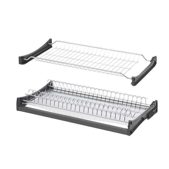 Сушка для посуды HUGOс профилем - базовая модель, которая отлично впишется в любой интерьер: -надежный и оптимальный прут: несущий - 5,3 мм, основной - 2,2 мм, -нержавеющая сталь, улучшенное устойчивое к коррозии гальваническое покрытие (хром), -жесткий прозрачный поддон толщиной 2,5мм в комплекте (возможность приобрести второй поддон дополнительно), -регулируемый нижний держатель и слот под ДВП для установки в ящик без дна, -подходит для установки в ящик как с ДСП 18 мм, так и с ДСП 16 мм. Количество мест для тарелок: 500 - 18 мест, 600 - 23 мест, 700 - 28 мест, 800 - 32 мест, 900 - 37 мест. В комплекте: -стальная сушка для чашек (хром) - 1 шт, -стальная сушка для тарелок (хром) - 1 шт, -пластиковый поддон (прозрачный) - 1 шт, -пластиковый держатель (серый) - 4 шт, -алюминиевый профиль (серый) - 2 шт. , -пластиковая вставка (серый) - 4 шт, -комплект крепежей, -брендированная инструкция AKS - 1шт.Технические характеристики: