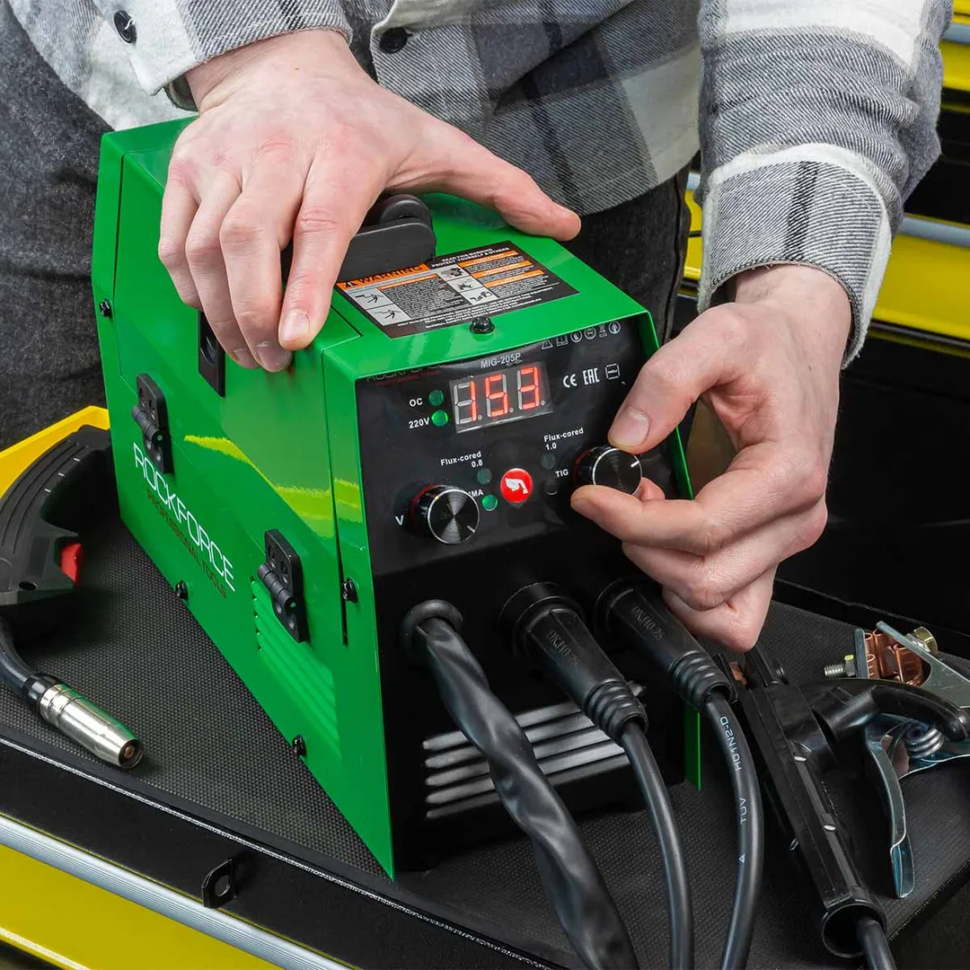 Сварочный аппарат 3.7кВт, 230В, Ø электрода 1.6-3.2 мм, Ø проволоки 0.8-1 мм, сварочный ток 20-205А RockForce RF-MIG-205P, описание и характеристики: