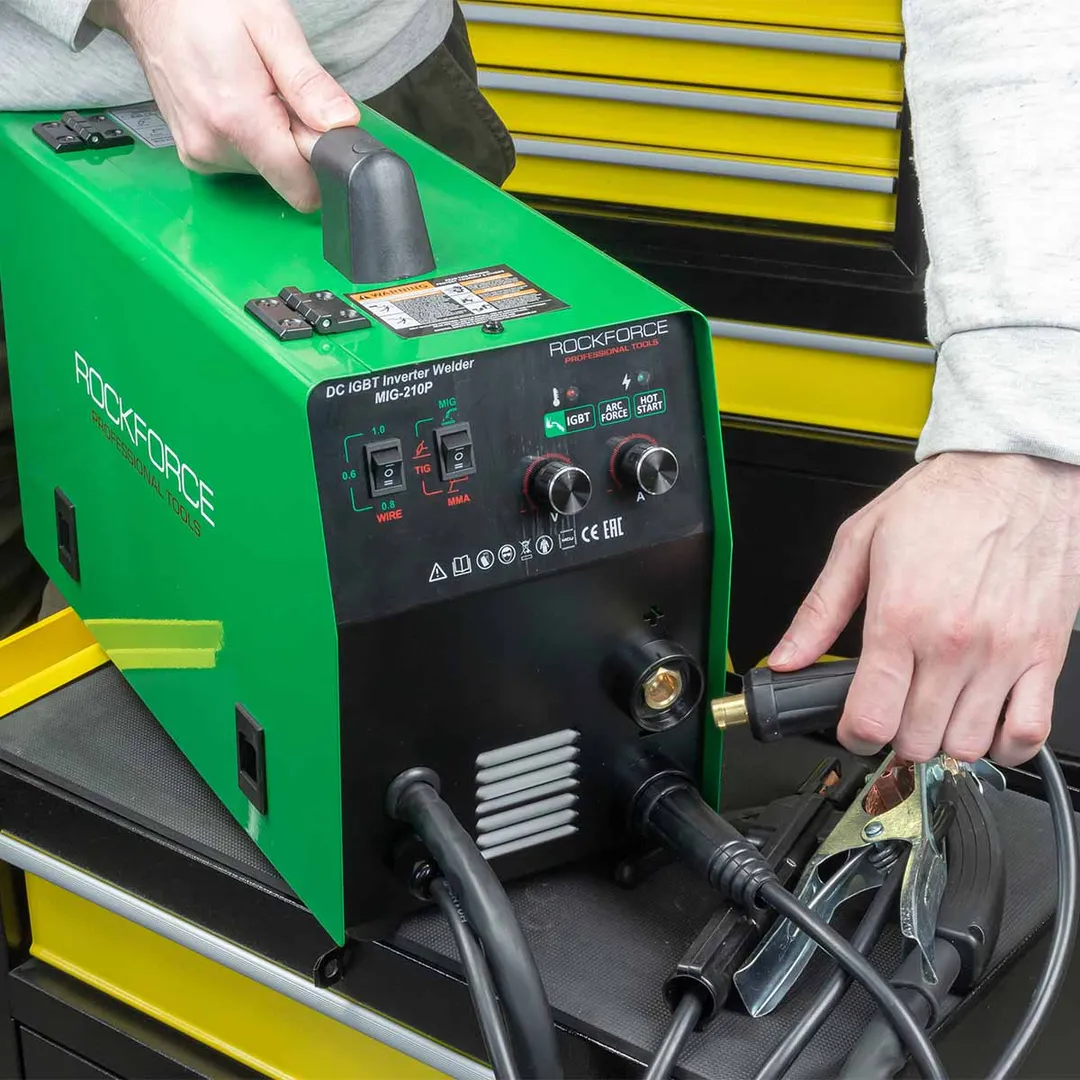 Сварочный аппарат 4.5кВт, 230В, Ø электрода 1.6-4 мм, Ø проволоки 0.6-1 мм, сварочный ток 40-210А RockForce RF-MIG-210P, описание и характеристики: