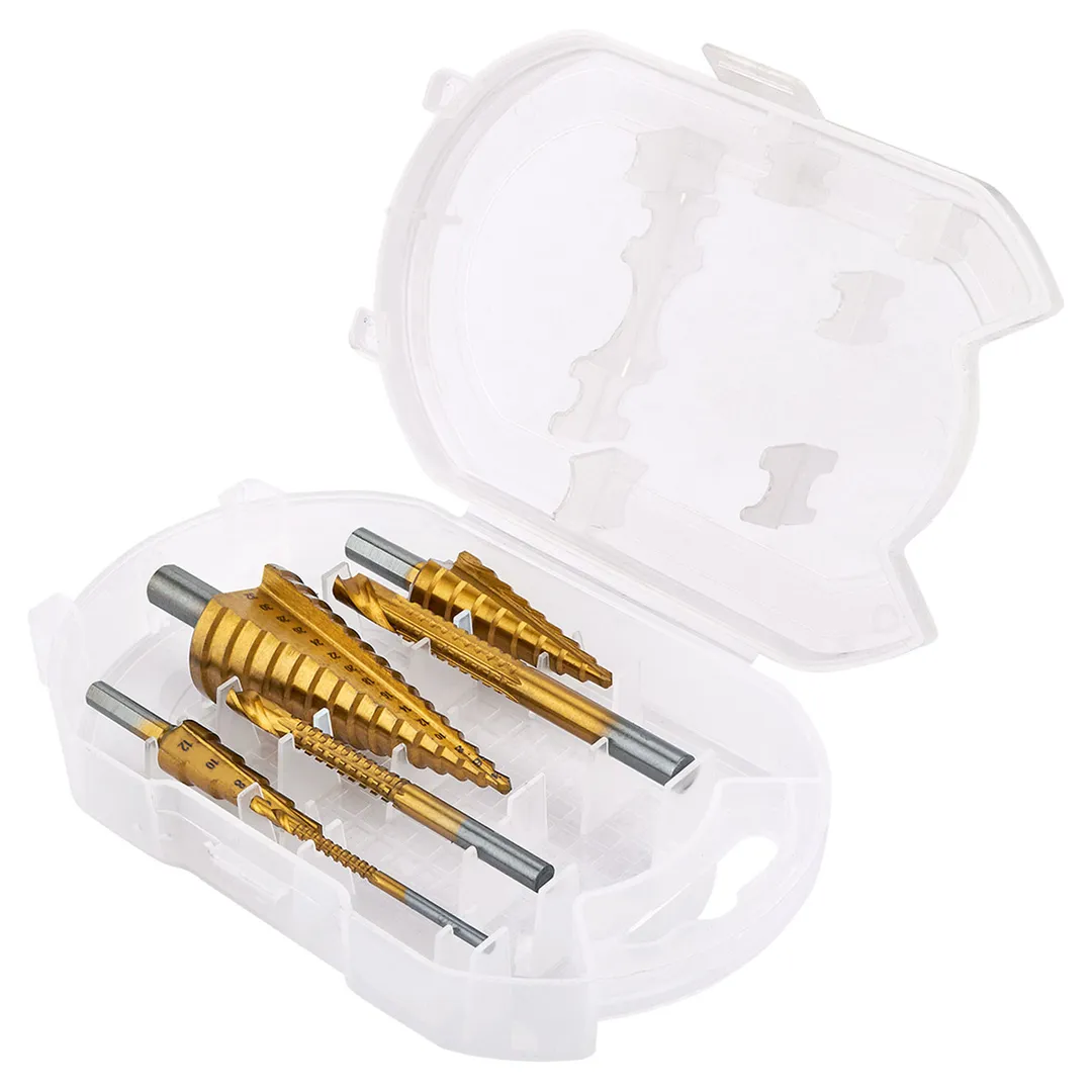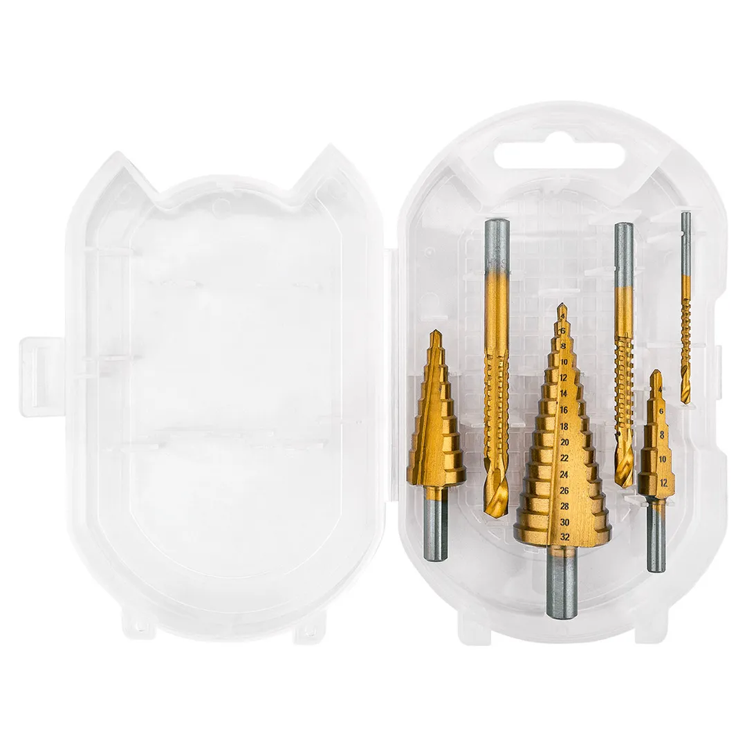 Набор сверл ступенчатых 4-12, 4-20, 4-32 мм, сверл-фрез 3, 6, 8 мм, по алюминию, меди, дереву, пластику 6 пр RockForce RF-44706