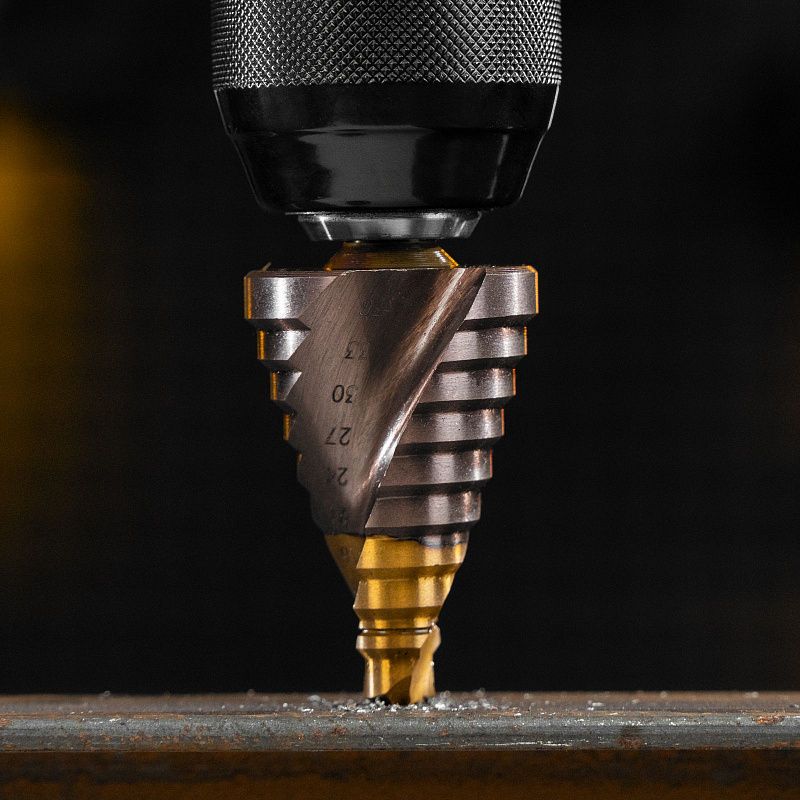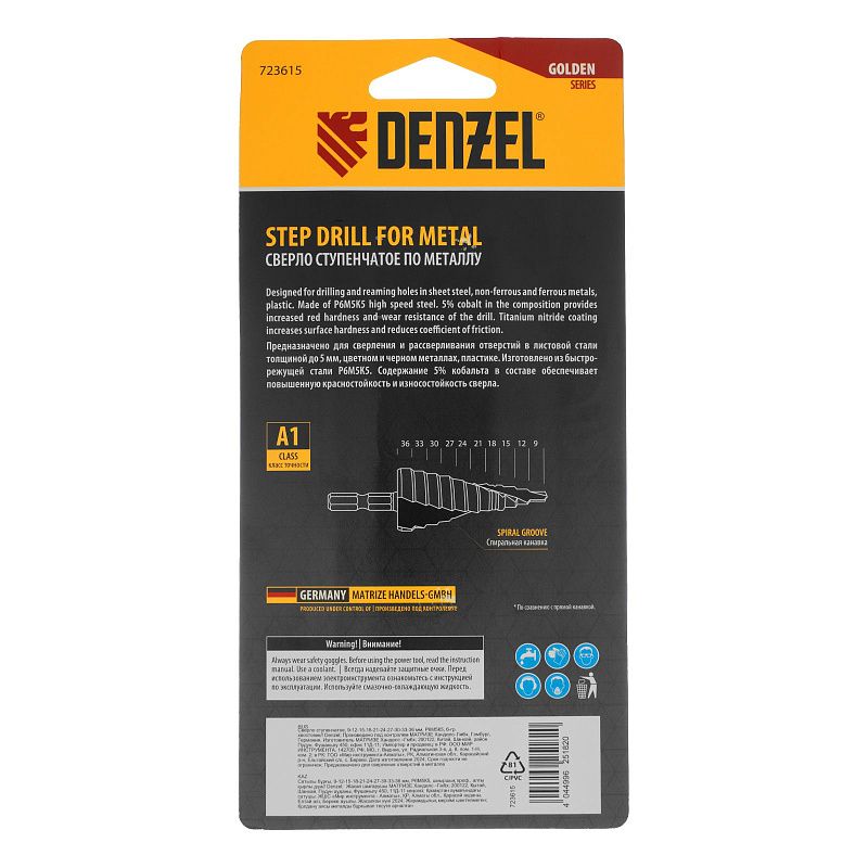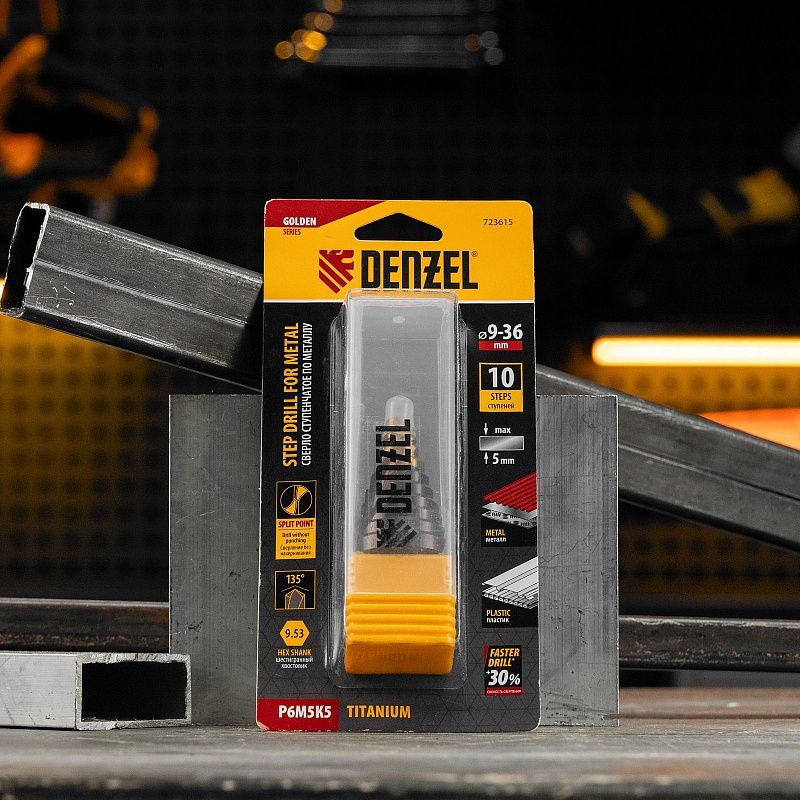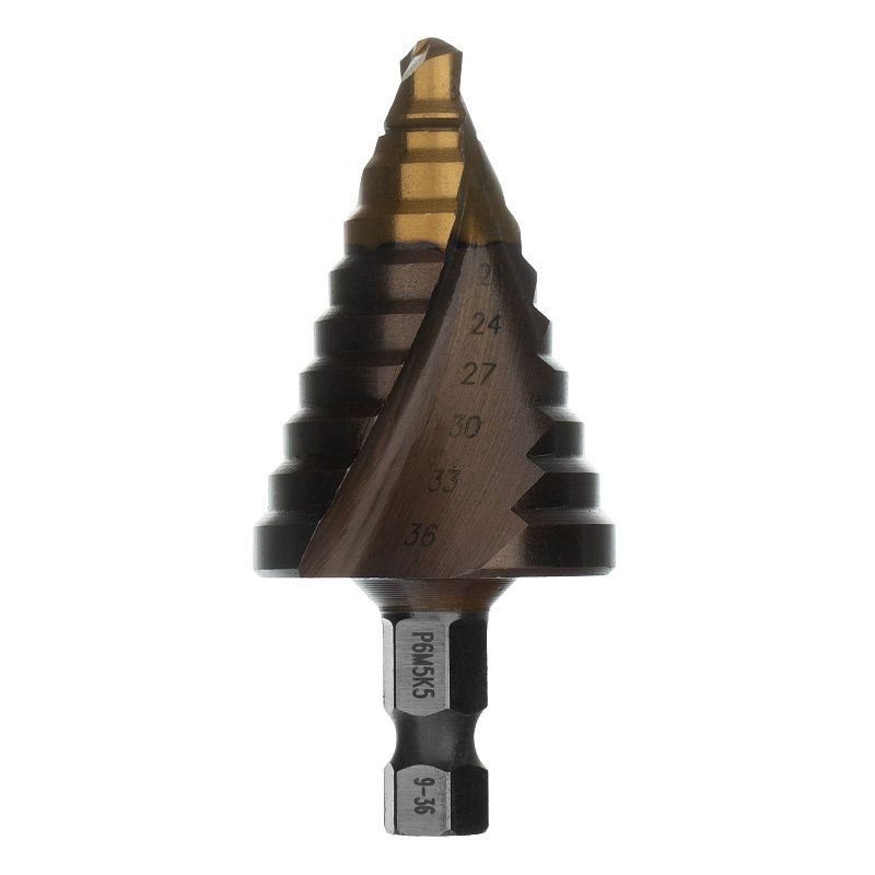 Сверло ступенчатое, 9-12-15-18-21-24-27-30-33-36 мм, Р6М5К5, 6-гр. хвостовик Denzel 723615