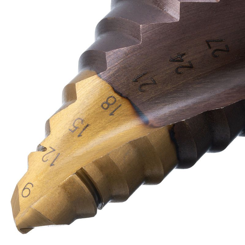 Сверло ступенчатое, 9-12-15-18-21-24-27-30-33-36 мм, Р6М5К5, 6-гр. хвостовик Denzel 723615, описание: