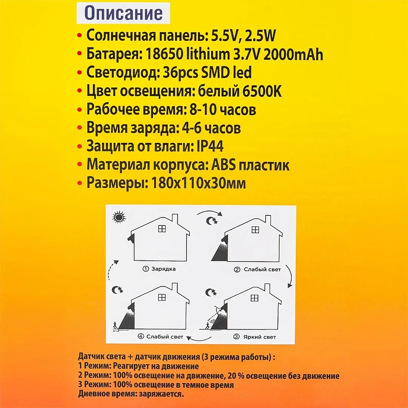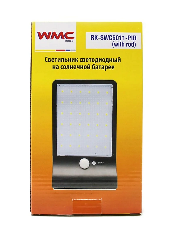 Светильник светодиодный на солнечной батарее с датч. движ-я и доп. креплением 5.5V,2.5W,18650Li,3.7V,2000mAh,36SMD Led,6500К,раб. время8-10ч,заряд.4-6 WMC TOOLS WMC-RK-SWC6011-PIR+доп.крепление