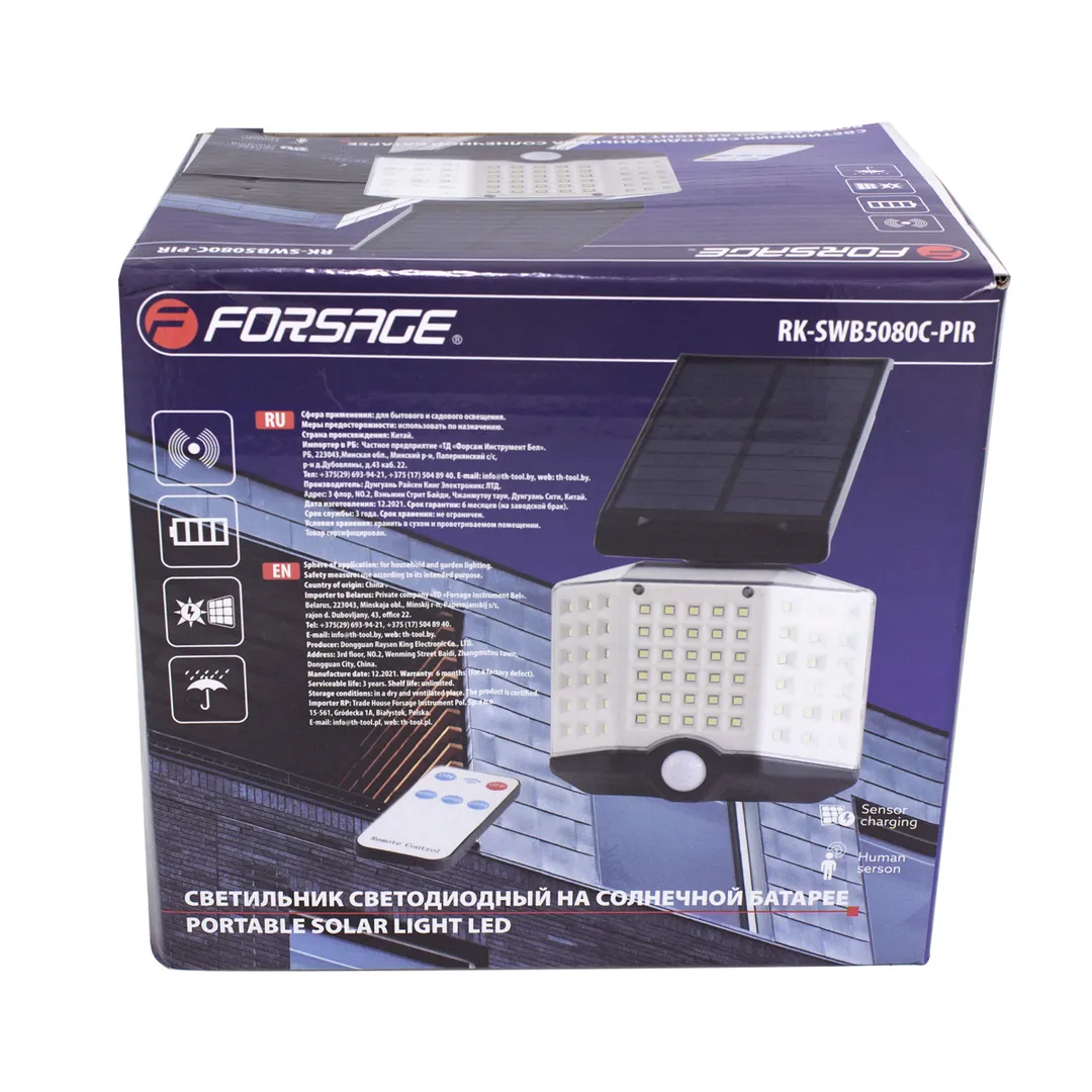 Светильник светодиодный на солнечной батарее с датчиком движения и пультом Forsage F-RK-SWB5080C-PIR, описание и характеристики: