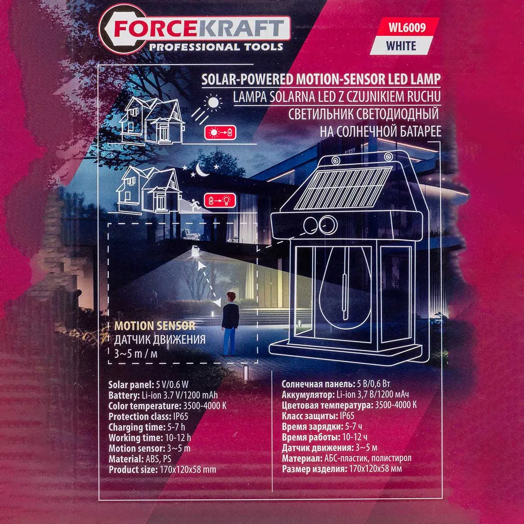 Светильник светодиодный на солнечной батарее с датчиком движения, цвет белый ForceKraft FK-WL6009 White, описание и характеристики: