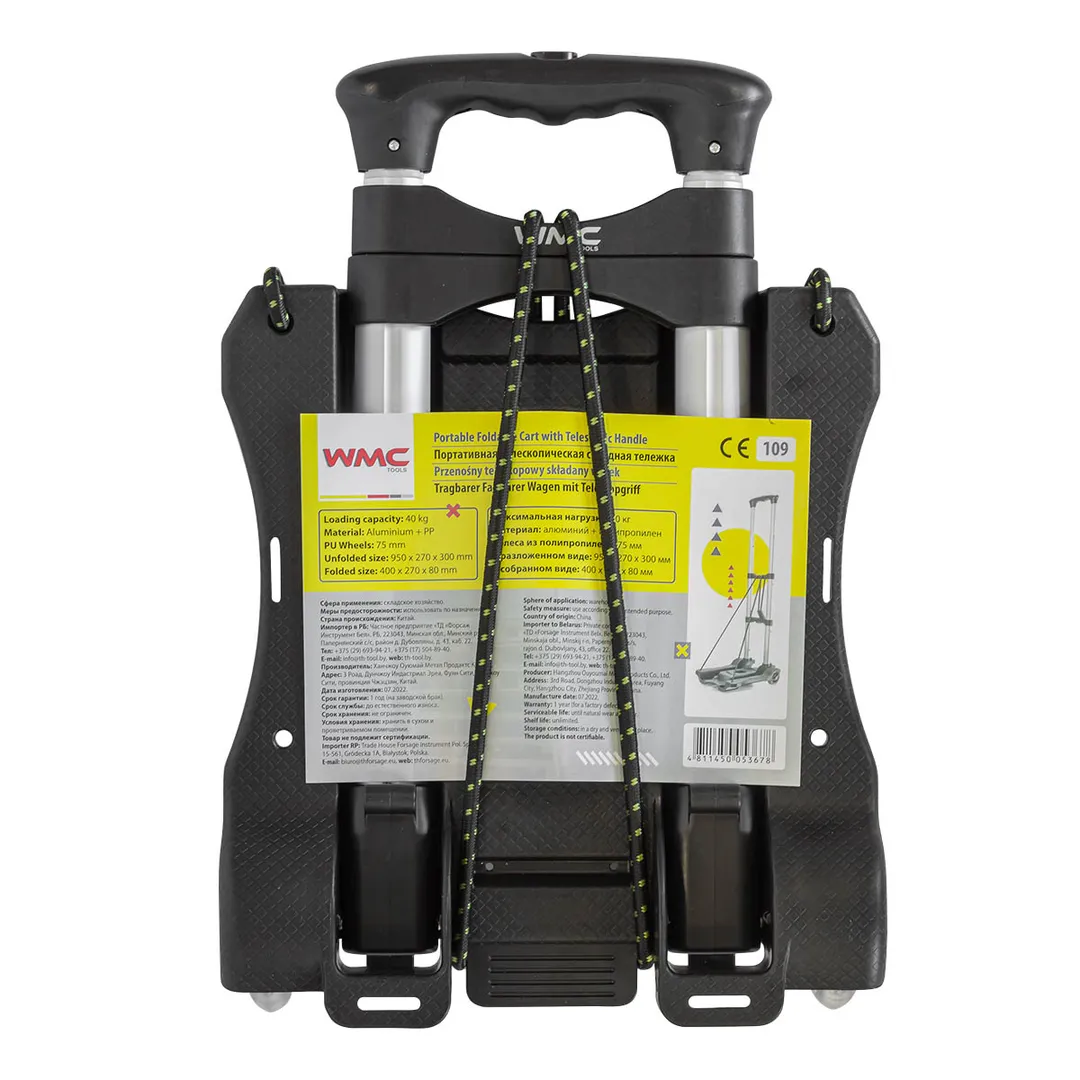 Тележка платформенная складная с телескопической ручкой+2крюка на эластичных ремнях, 270х300 мм, г/п 40 кг WMC TOOLS WMC-109