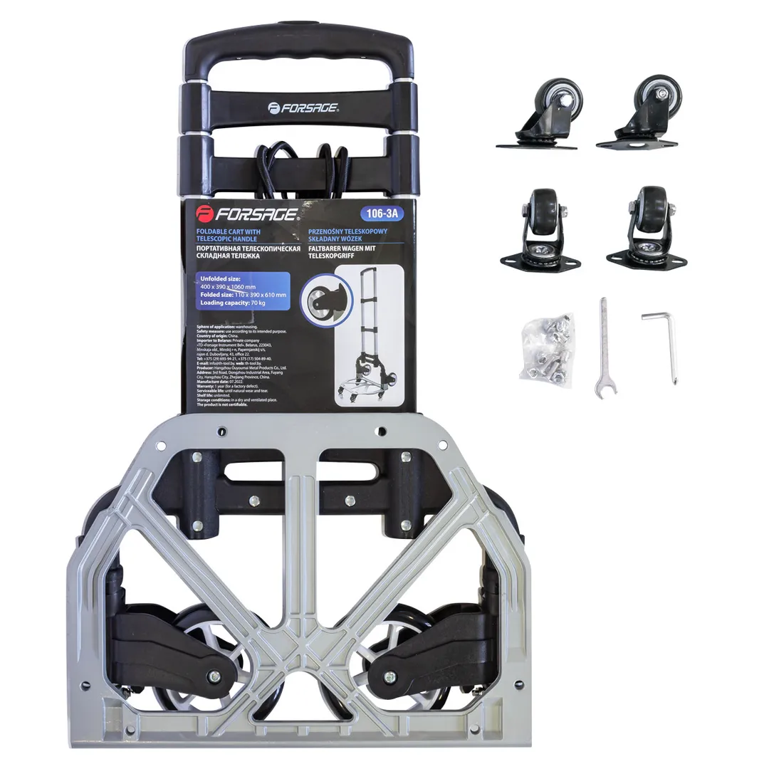 Тележка платформенная складная с телескопической ручкой двухпозиционная, 390х400 мм, г/п 70 кг Forsage F-106-3A, описание и характеристики: