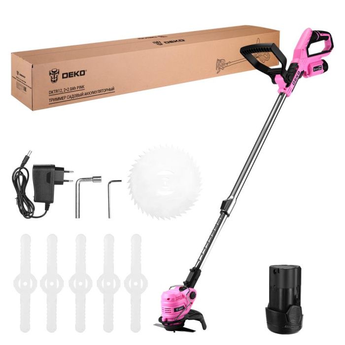- DKTR12 2*2.0Ah PINK — это ручная косилка на батарейках, не требующая сложного обслуживания. Компактная конструкция и небольшой вес делают модель удобной для всех пользователей, включая женщин, кому важны лёгкость, маневренность и комфорт при работе на участке.