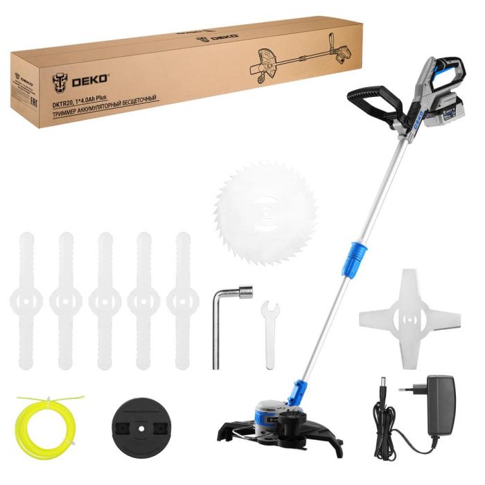 - Триммер аккумуляторный бесщеточный DEKO DKTR20, 1*4.0Ач Plus - компактная модель, удобная для скашивания травы в труднодоступных местах, вдоль заборов, клумб, подравнивания газонов, краев садовых дорожек.