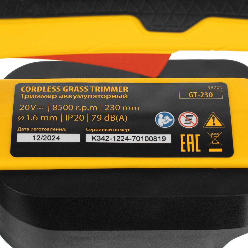 Триммер аккумуляторный GT-230, 230 мм, Li-Ion, 20 В Denzel 58701, описание: