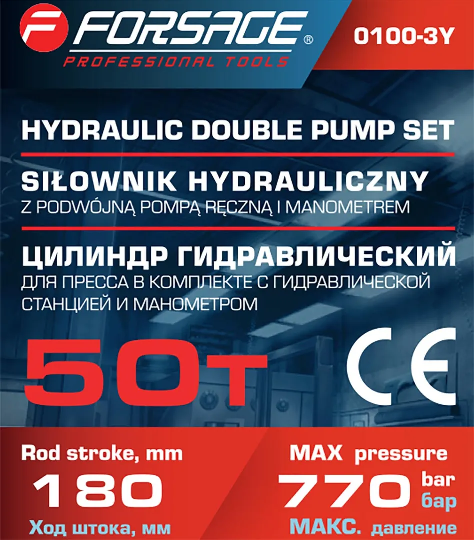 Цилиндр гидравлический 50 т, для пресса в комплекте со станцией гидравлической и манометром Forsage F-0100-3Y