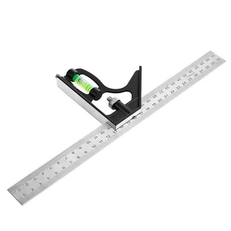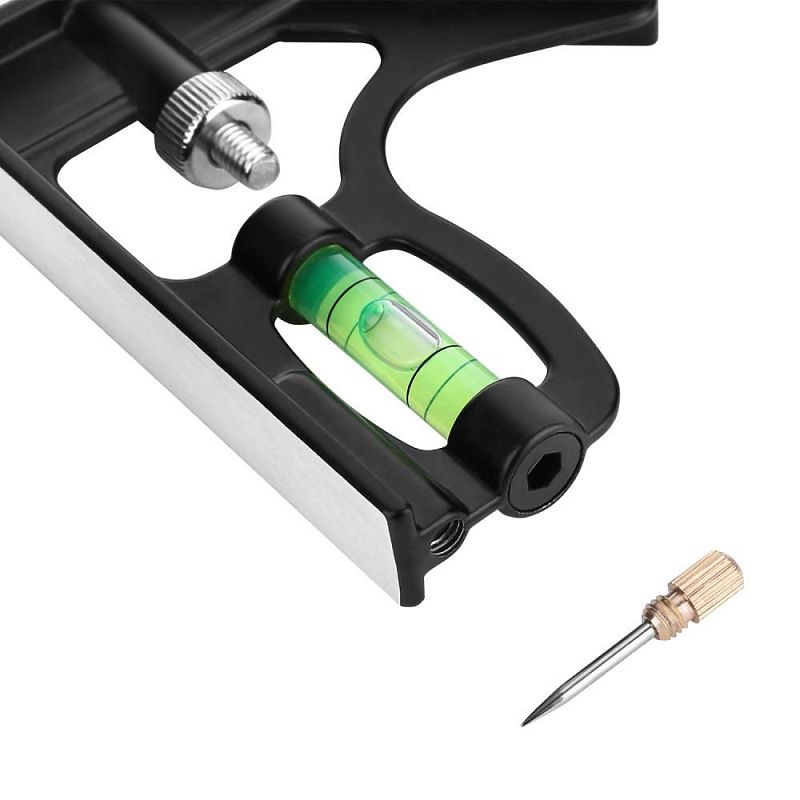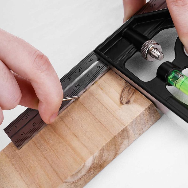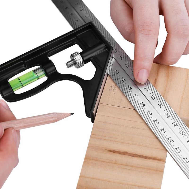- Строительный угольник с выгравированной шкалой на обеих сторонах линейки предназначен для бытового использования, где точность и удобство измерений критически важны. Двусторонняя маркировка позволяет работать с инструментом в любом положении, не теряя времени на его поворот, а пузырьковая ампула обеспечивает контроль горизонтальности или вертикальности поверхности. Встроенная чертилка упрощает нанесение рисок, исключая необходимость в дополнительных инструментах, что особенно актуально при монтаже полок, установке плинтусов или разметке стен для покраски.