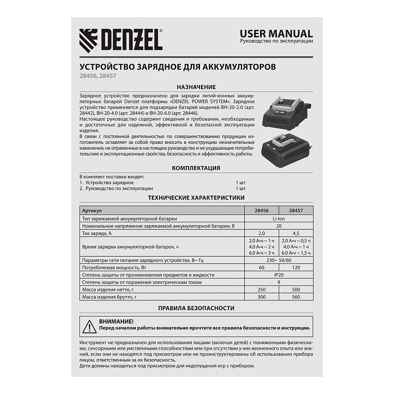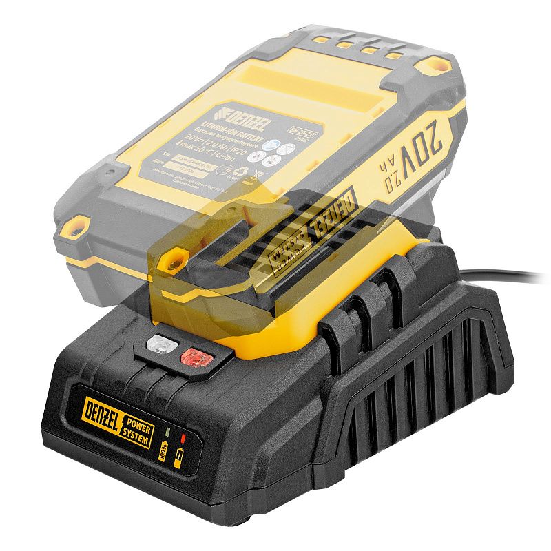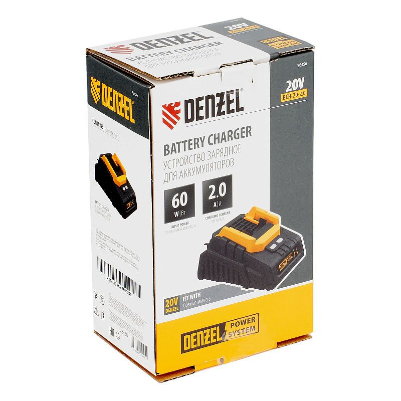 Зарядное устройство Denzel BCH-20-2.0 28456 предназначено для восстановления работоспособности Li-Ion аккумуляторов единой платформы Denzel Power System 20 V (артикулы 28442, 28444 и 28446). Поддерживает ток заряда 2,0 A. Обеспечивает быструю и полную зарядку, что позволяет избежать длительных перерывов в работе с аккумуляторным инструментом.