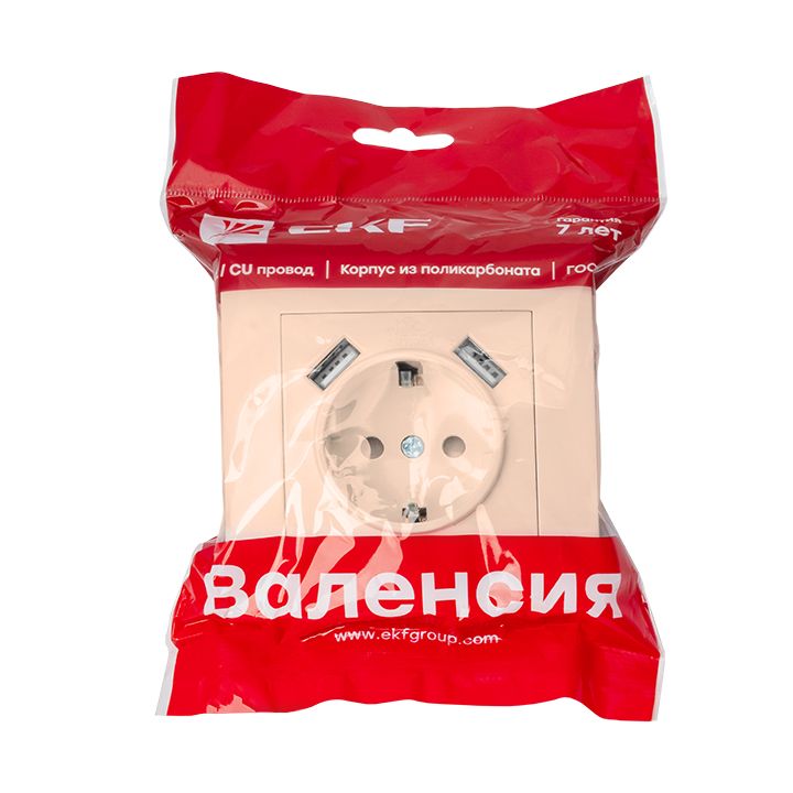 Валенсия розетка 1-местная с/з 16А кремовая с защ, штор, с 2 USB 2,1А EKF PROxima EWR16-028-20-2USB, технические характеристики: