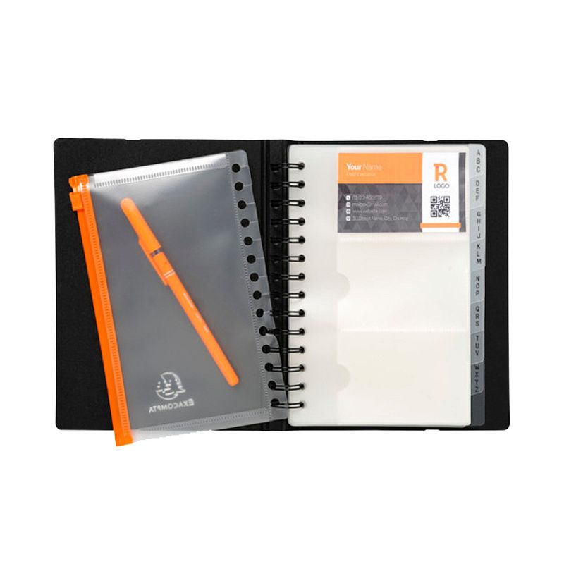 Визитница Exacard содержит 20 листов на 120/240/360 визитных карточек размером 60×90 мм. Эластичный ремешок гарантирует безопасное закрытие визитницы. А экологически чистый материал Exacard не только устойчив к внешним воздействиям и влаге, что обеспечивает сохранность ваших визитных карт, но и на 80% состоит из вторично переработанных материалов.