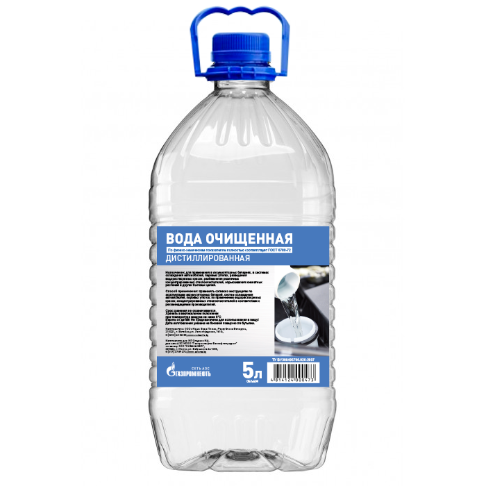 Вода дистиллированная Газпромнефть 5 литров. Вода очищенная от растворённых в ней минеральных солей, органических веществ и других примесей путём дистилляции. С применением специальной технологии, позволяющей достичь лучших показателей необходимых для применения, как в бытовых, так и в технических целях.