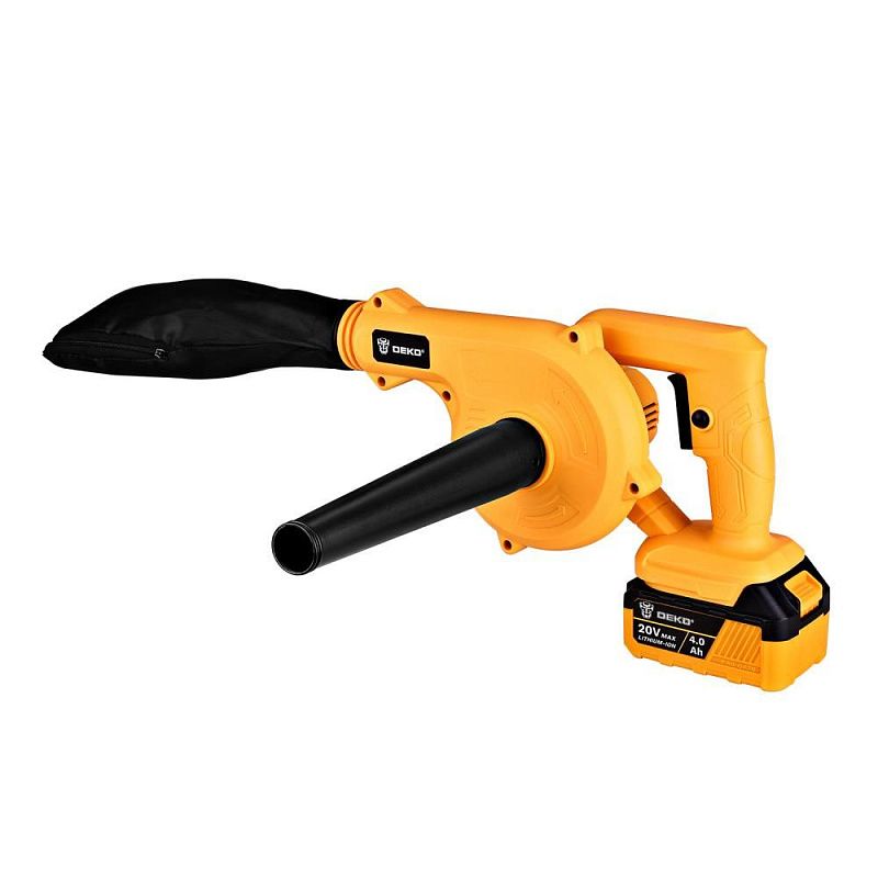 - Аккумуляторная воздуходувка DEKO DKBL20V — это компактный и мощный ручной электроинструмент, предназначенный для эффективной уборки садовых участков, дачи, территории возле авто или гаража. Работает от Li-Ion аккумулятора напряжением 20 В и ёмкостью 4000 мАч, что обеспечивает продолжительную автономную работу без подключения к электросети.