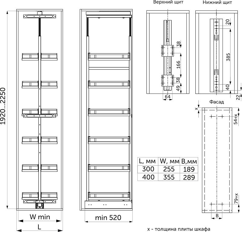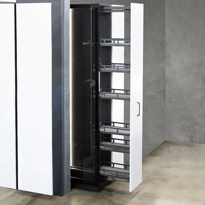 Выдвижные колонны-карго FOCUS премиальное решение для организации хранения на кухне: - современный дизайн, стильный, лаконичный внешний вид в матовом графитовом цвете, - толстый надежный прут, стальное дно из листового металла, жесткая сварная конструкция, качественные сварные швы (лазерная сварка), -эпоксидно-полиэфирное покрытие, - предустановленное противоскользящее покрытие, - регулировка расположения и количества установленных полок (съемные), - регулировка высоты H1920-2250мм, - механизм полного выдвижения с доводчиком, - рекомендованная нагрузка на полку - 10 кг. Продуманная конструкция колонн-карго помогает организовать хранение бутылок, банок, столовой посуды, продуктов на кухне. В комплекте: - корзина с противоскользящим покрытием - 6 шт, - комплект нижних шариковых направляющих с доводчиком, - комплект верхних направляющих скрытого монтажа с доводчиком, - стальная рама, - комплект креплений корзин, - комплект креплений к фасаду, - комплект крепежей, - шаблон для установки, - инструкция.Технические характеристики: