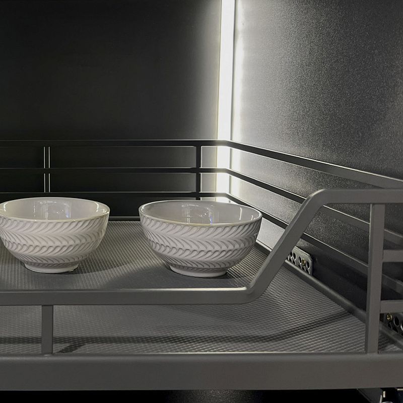 Выдвижные корзины FOCUS премиальное решение для организации хранения на кухне: -современный дизайн, стильный, лаконичный внешний вид в матовом графитовом цвете, -толстый надежный прут, стальное дно из листового металла, жесткая сварная конструкция, качественные сварные швы (лазерная сварка), --эпоксидно-полиэфирное покрытие, -в корзине предустановлено противоскользящее покрытие, -направляющие скрытого монтажа с доводчиком PRIME by AKS полного выдвижения с нагрузкой до 25 кг (рекомендованная нагрузка на корзину 20кг), -съемное крепление к фасаду (возможна установка в ящик под выдвижной и распашной фасад), -в корзине установлен комплект быстрого монтажа направляющих, предусмотрена подробная инструкция и шаблон для быстрой и легкой установки, -подходит для ящика как с ДСП 18 мм, так и с ДСП 16 мм. Продуманная конструкция корзин помогает организовать хранение столовой посуды, продуктов на кухне. В комплекте: -стальная корзина с противоскользящим ковриком (графит) - 1 шт, -комплект направляющих скрытого монтажа с доводчиком PRIME by AKS - 1 компл, -комплект пластиковых вставок для ДСП16, -комплект быстрой установки направляющих (установлен в корзине), -комплект креплений к фасаду, -комплект крепежей, -шаблон для установки PRIME by AKS - 1 шт, -брендированная инструкция PRIME by AKS - 1 шт.Технические характеристики:
